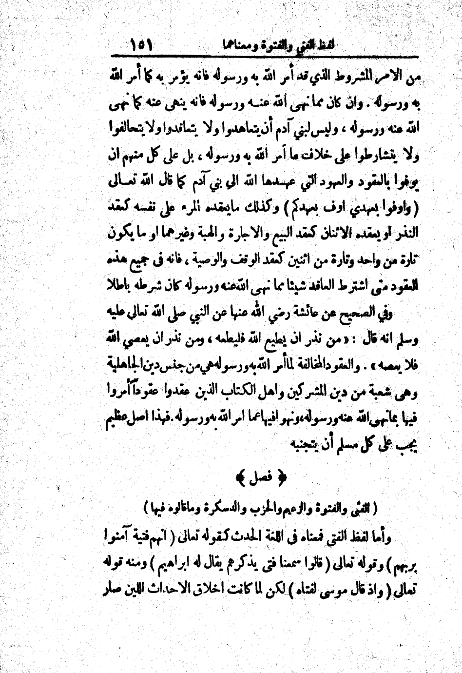 من الأمر المشروط الذي قد أمر الله به ورسوله فإنه يؤمر به كما أمر الله به ورسوله، وإن كان مما نهى عنه ورسوله فإنه ينهى عنه كما نهى الله عنه ورسوله، وليس لبني آدم أن يتعاهدوا ولا يتعاقدوا ولا يتحالفوا ولا يتشارطوا على خلاف ما أمر الله به ورسوله، بل على كل منهم أن يوفوا بالعقود والعهود التي عهدها الله إلى بني آدم كما قال الله تعالى: " واوفوا بعهدي اوف بعهدكم " وكذلك ما يعقده المرء على نفسه كعقد النذر أو يعقده الاثنان كعقد البيع والإجارة والهبة وغيرهما أو ما يكون تارة من واحد وتارة من اثنين كعقد الوقف والوصية، فإنه في جميع هذه العقود متى اشترط العاقد شيئاً مما نهى الله عنه ورسوله كان شرطه باطلاً.