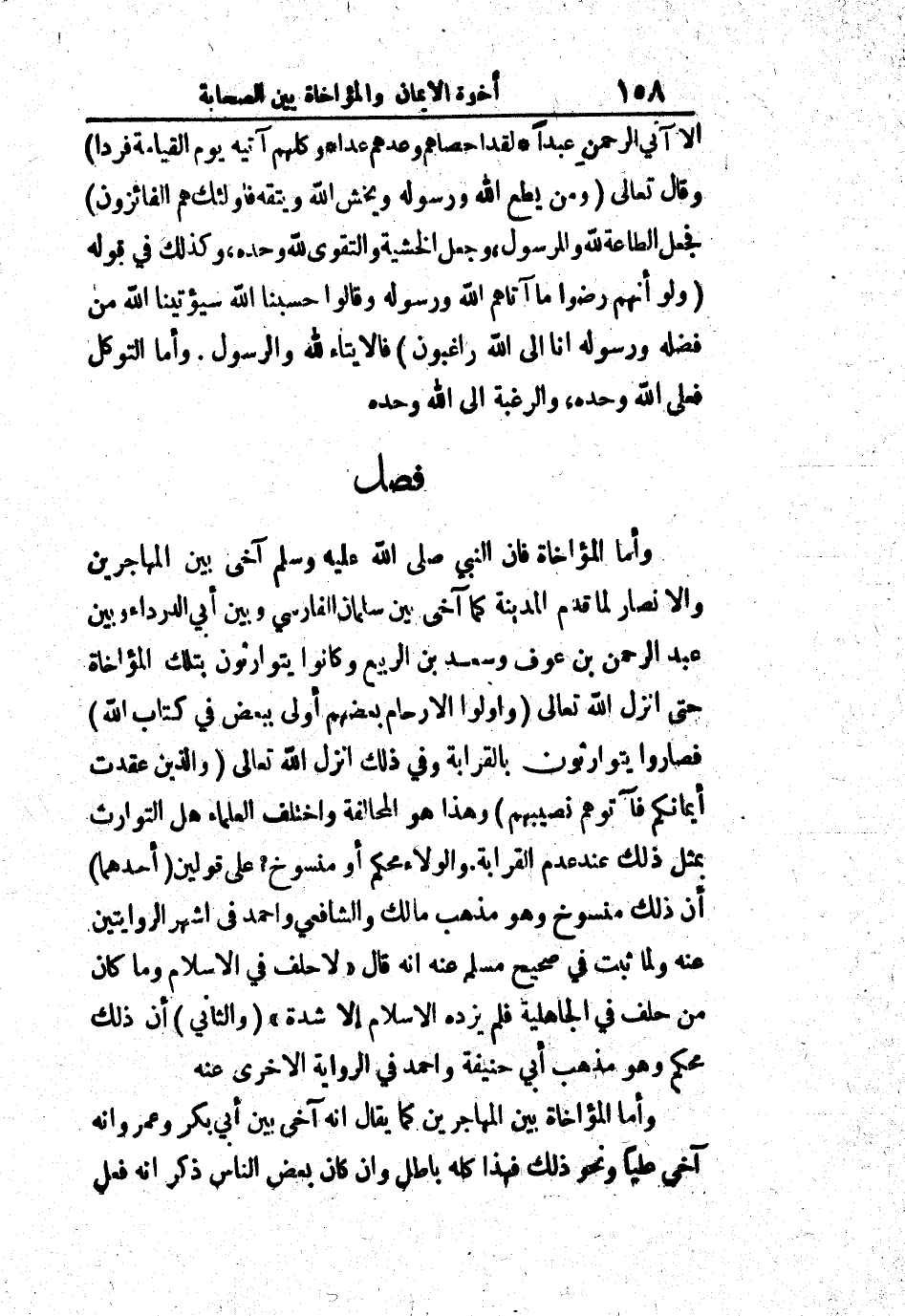فصل: وأما المؤاخاة فإن النبي صلى الله عليه وسلم آخى بين المهاجرين والأنصار لما قدم المدينة كما آخى بين سلمان الفارسي وبين أبي الدرداء، وبين عبد الرحمن بن عوف وسعد بن الربيع وكانوا يتوارثون بتلك المؤاخاة حتى أنزل الله تعالى: " وأولوا الأرحام بعضهم أولى ببعض في كتاب الله " فصاروا يتوارثون بالقرابة وفي ذلك أنزل الله تعالى: " والذين عقدت أيمانكم فآتوهم نصيبهم " وهذا هو المحالفة واختلف العلماء عل التوارث بمثل ذلك عند عدم القرابة والولاء محكم أو منسوخ؟ على قولين: أحدهما أن ذلك منسوخ وهو مذهب مالك والشافعي وأحمد في أشهر الروايتين عنه ولما ثبت في صحيح مسلم عنه أنه قال: " لا حلف في الإسلام وما كان من حلف في الجاهلية فلم يزده الإسلام إلى شدة ".