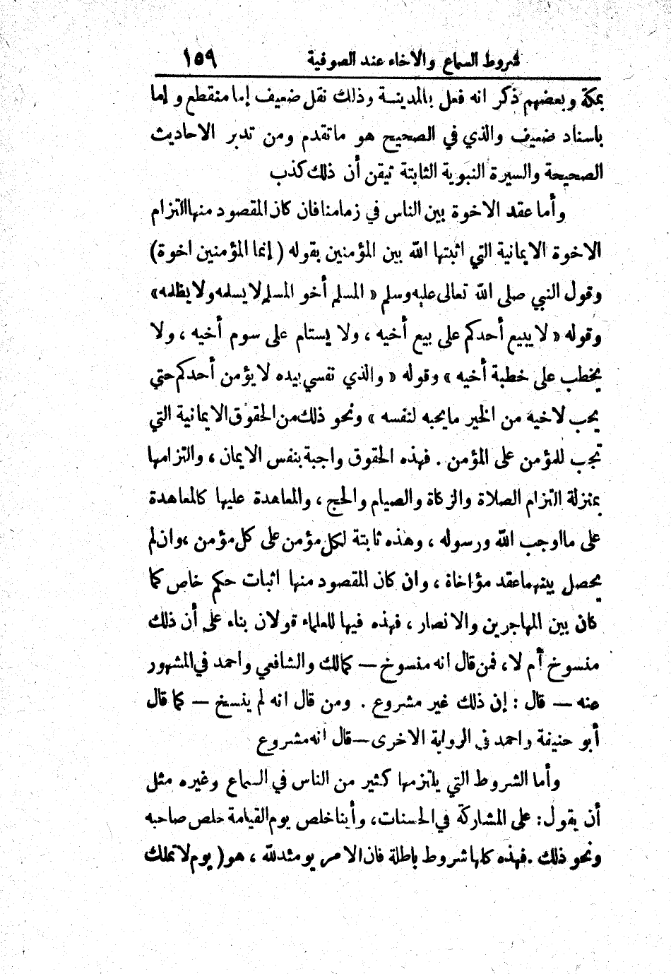وأما عقد الأخوة بين الناس في زماننا فإن كان المقصود منها التزام الأخوة الإيمانية التي أثبتها الله بين المؤمنين بقوله: " إنما المؤمنين أخوة " وقول النبي صلى الله تعالى عليه وسلم: " المسلم أخو المسلم لا يسلمه ولا يظلمه " وقوله: " لا يبيع أحدكم على بيع أخيه، ولا يستام على سوم أخيه، ولا يخطب على خطبة أخيه " وقوله: " والذي نفسي بيده لا يؤمن أحدكم حتى يحب لأخيه من الخير ما يحبه لنفسه " ونحو ذلك من الحقوق الإيمانية التي تجب للمؤمن على المؤمن، فهذه الحقوق واجبة بنفس الإيمان، والتزامها بمنزلة الصلاة والزكاة والصيام والحج، والمعاهدة عليها كالمعاهدة على ما أوجب الله ورسوله، وهذه ثابتة لكل مؤمن على كل مؤمن، وإن لم يحصل بينهما عقد مؤاخاة، وإن كان المقصود منها إثبات حكم خاص كما كان بين المهاجرين والأنصار، فهذه فيها للعلماء قولان بناءً على أن ذلك منسوخ أم لا، فمن قال: إنه منسوخ - كمالك والشافعي وأحمد في المشهور عنه - قال: إن ذلك غير مشروع. ومن قال إنه لم ينسخ - كما قال أبو حنيفة وأحمد في الرواية الأخرى - قال: إنه مشروع.