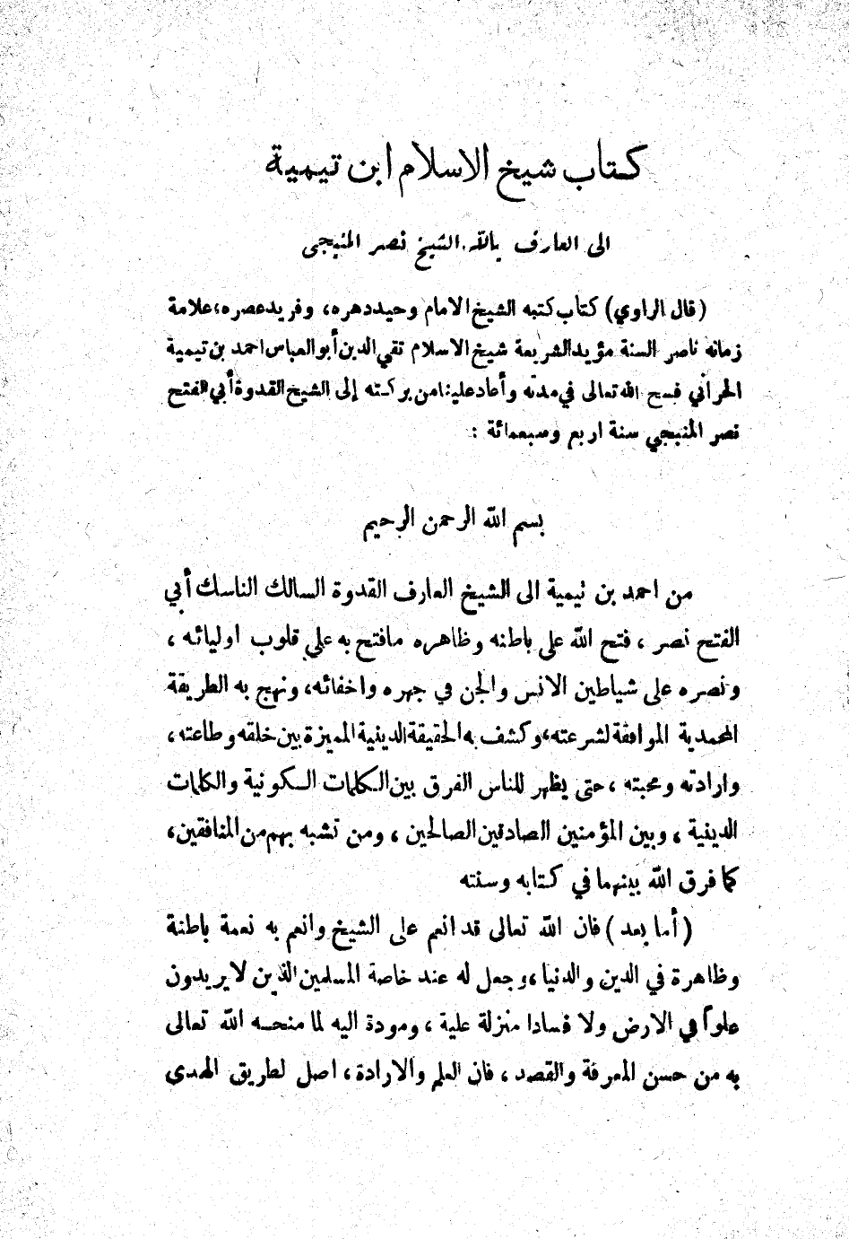 بسم الله الرحمن الرحيم: من أحمد بن تيمية إلى الشيخ العارف القدوة السالك الناسك أبي الفتح نصر، فتح الله على باطنه وظاهره ما فتح به على قلوب أوليائه، ونصره على شياطين الإنس والجن في جهره وإخفائه، ونهج به الطريقة المحمدية الموافقة لشرعته، وكشف به الحقيقة الدينية المميزة بين خلقه وطاعته، وإرادته ومحبته، حتى يظهر للناس الفرق بين الكلمات الكونية والكلمات الدينية، وبين المؤمنين الصادقين الصالحين، ومن تشبه بهم من المنافقين، كما فرق الله بينهما في كتابه وسنته.