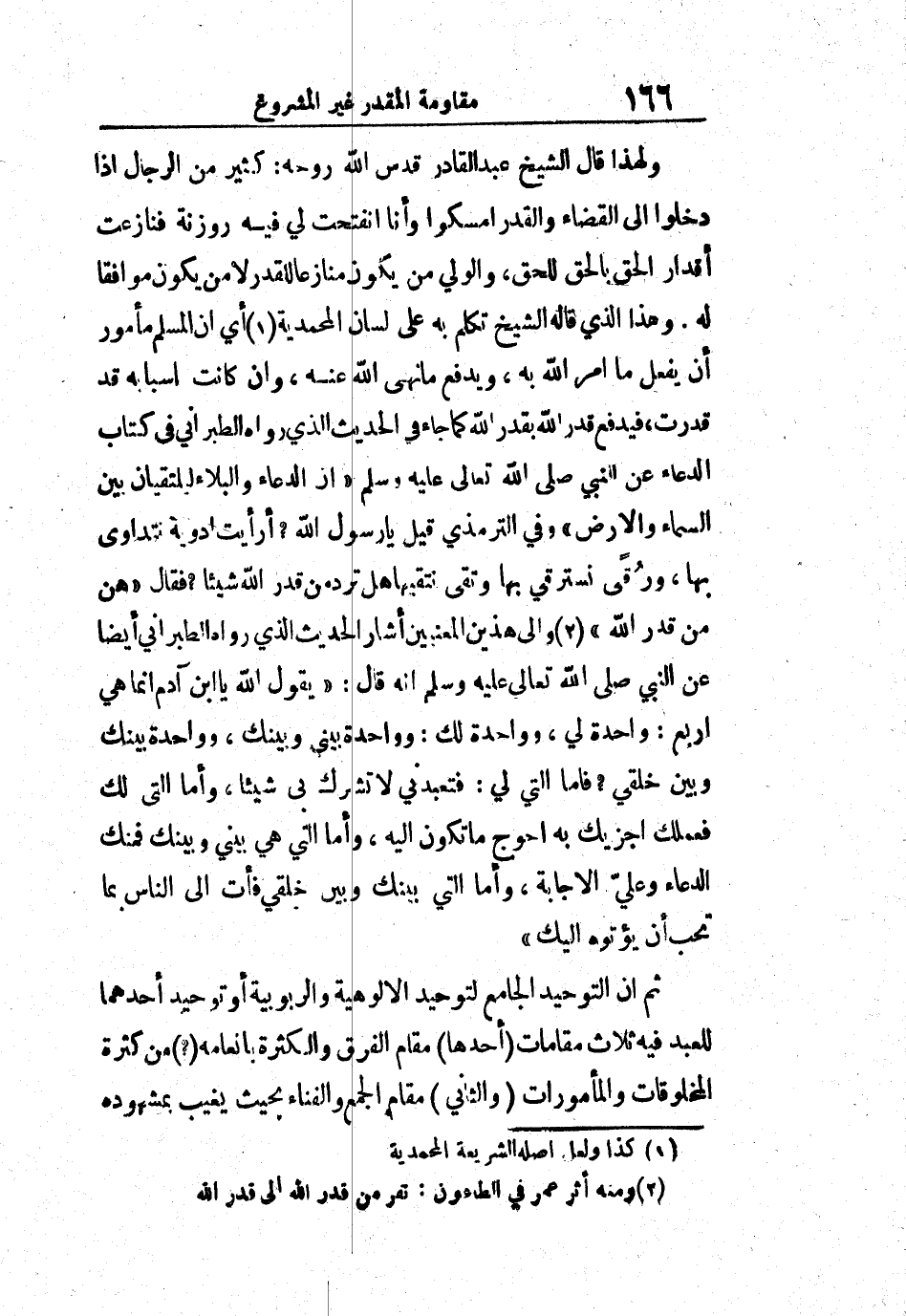 ولهذا قال الشيخ عبد القادر قدس الله روحه كثير من الرجال إذا دخلوا إلى القضاء والقدر أمسكوا وأنا انفتحت لي فيه روزنة فنازعت أقدار الحق بالحق للحق، والولي من يكون منازعاً للقدر لا من يكون موافقاً له. وهذا الذي قاله الشيخ تكلم به على لسان المحمدية (1) ، أي أن المسلم مأمور أن يفعل ما أمر الله به، ويدفع ما نهى الله عنه، وإن كانت أسبابه قد قدرت، فيدفع الله بقدر الله كما جاء في الحديث الذي رواه الطبراني في كتاب الدعاء عن النبي صلى الله تعالى عليه وسلم: " إن الدعاء والبلاء ليلتقيان بين السماء والأرض " وفي الترمذي قيل: يا رسول الله؟ أرأيت أدوية نتداوى بها، ورقي نسترقي بها وتقى نتقيها هل ترد من قدر الله شيئاً؟ فقال: " هن من قدر الله " (2) وإلى هذين المعنيين أشار الحديث الذي رواه الطبراني أيضاً عن النبي صلى الله تعالى عليه وسلم أنه قال: " يقول الله يا ابن آدم إنما هي أربع: واحدة لي، وواحدة لك، وواحدة بيني وبينك، وواحدة بينك وبين خلقي. فأما التي لي: فتعبدني لا تشرك بي شيئاً، وأما التي لك فعملك أجزيك به أحوج ما تكون إليه، وأما التي هي بيني وبينك فمنك الدعاء وعلي الإجابة، وأما التي بينك وبين خلقي فأت الناس بما تحب أن يؤتوه إليك ".