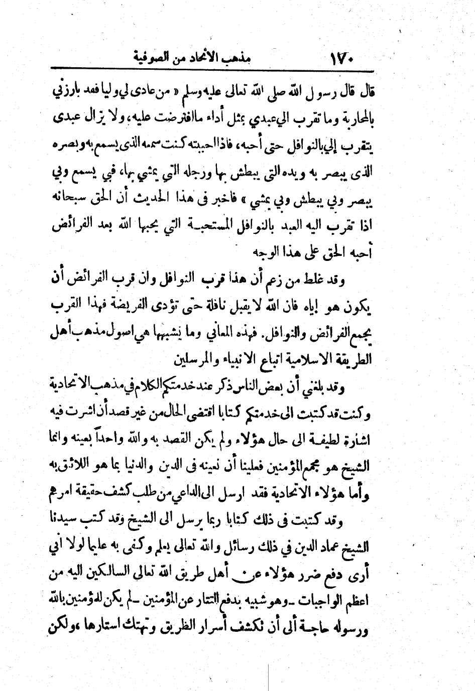 وقد بلغني أن بعض الناس ذكر عند خدمتكم الكلام في مذهب الاتحادية وكنت قد كتبت إلى خدمتكم كتاباً اقتضى الحال من غير قصد أن أشرت فيه إشارة لطيفة إلى حال هؤلاء ولم يكن القصد به والله واحداً بعينه وإنما الشيخ هو مجمع المؤمنين فعلينا أن نعينه في الدين والدنيا بما هو اللائق به، وأما هؤلاء الاتحادية فقد أرسل إلى الداعي من طلب كشف حقيقة أمرهم وقد كتبت في ذلك كتاباً ربما يرسل إلى الشيخ وقد كتب سيدنا الشيخ عماد الدين في ذلك رسائل والله تعالى يعلم وكفى به عليماً لولا أني أرى دفع ضرر هؤلاء عن أهل طريق الله تعالى السالكين إليه من أعظم الواجبات - وهو شبيه بدفع التتار عن المؤمنين - لم يكن للمؤمنين بالله ورسوله حاجة إلى أن تكشف أسرار الطريق وتهتك أستارها ولكن