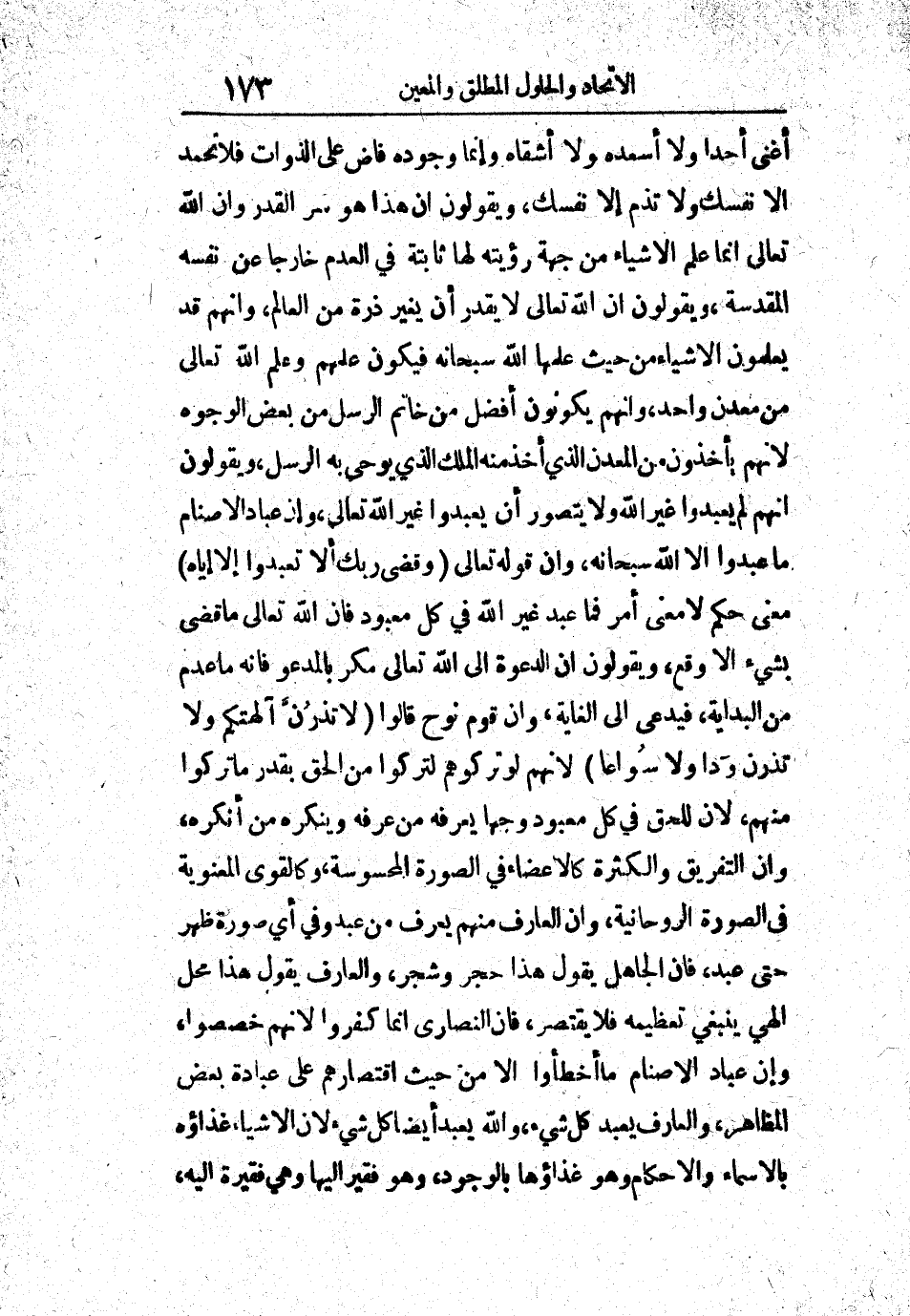 أغنى أحداً ولا أسعده ولا أشقاه وإنما وجوده فاض على الذوات فلا تحمد إلا نفسك ولا تذم إلا نفسك، ويقولون إن هذا هو سر القدر وإن الله تعالى إنما علم الأشياء من جهة رؤيته لها ثابتة في العدم خارجاً عن نفسه المقدسة، ويقولون إن الله تعالى لا يقدر أن يغير ذرة من العالم، وإنهم قد يعلمون الأشياء من حيث علمها سبحانه فيكون علمهم وعلم الله تعالى من معدن واحد، وإنهم يكونون أفضل من خاتم الرسل من بعض الوجوه لأنهم يأخذون من المعدن الذي أخذ منه الملك الذي يوحى به الرسل، ويقولون إنهم لم يعبدوا غير الله ولا يتصور أن يعبدوا غير الله تعالى، وإن عباد الأصنام ما عبدوا إلا الله سبحانه، وإن قوله تعالى: " وقضى ربك ألا تعبدوا إلا إياه " معنى حكم لا معنى أمر فما عبد غير الله في كل معبود فإن الله تعالى ما قضى بشيء إلا وقع، ويقولون إن الدعوة إلى الله تعالى المكر بالمدعو فإنه ما عدم من البداية، فيدعى إلى الغاية، وإن قوم نوح قالوا: " لا تذرن آلهتكم ولا تذرن وداً ولا سواعاً " لأنهم لو تركوهم لتركوا من الحق بقدر ما تركوا منهم، لأن الحق في كل معبود وجهاً يعرفه من عرفه وينكره من أنكره وإن التفريق والكثرة كالأعضاء في الصورة المحسوسة، كالقوى المعنوية في الصورة الروحانية، وإن العارف منهم يعرف من عبد وفي أي صورة ظهر حتى عبد، فإن الجاهل يقول هذا حجر وشجر، والعارف يقول هذا محل إلهي ينبغي تعظيمه فلا يقتصر، فإن النصارى إنما كفروا لأنهم خصصوا، وإن عباد الأصنام ما أخطأوا إلا من حيث اقتصارهم على عبادة بعض المظاهر، والعارف يعبد كل شيء، والله يعبد أيضاً كل شيء لأن الأشياء غذاؤه بالأسماء والأحكام وهو غذاؤها بالوجود، وهو فقير إليها وهي فقيرة إليه،