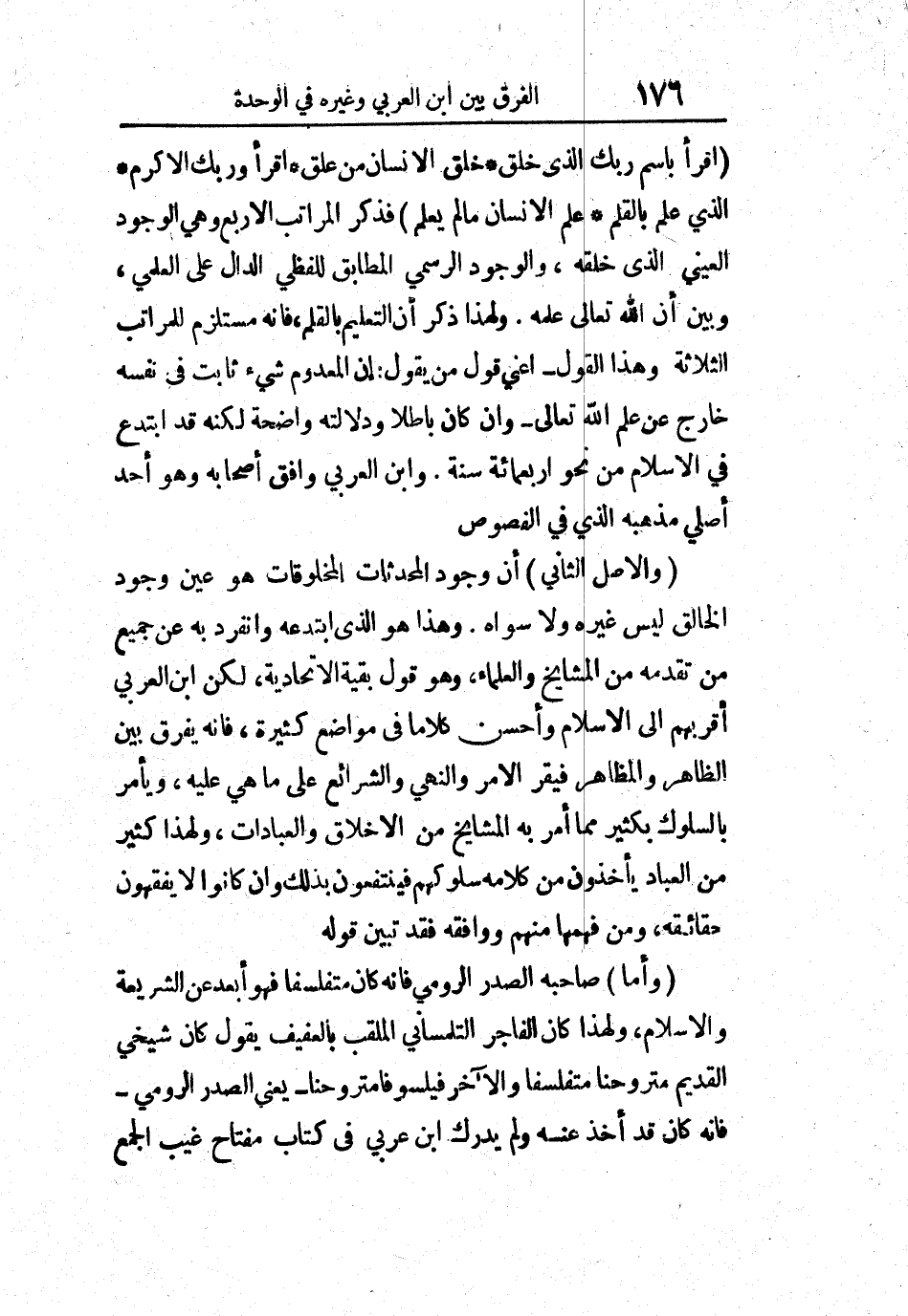 " اقرأ باسم ربك الذي خلق، خلق الإنسان من علق، اقرأ وربك الأكرم، الذي علم بالقلم، علم الإنسان ما لم يعلم " فذكر المراتب الأربع وهي الوجود العيني الذي خلقه، والوجود الرسمي المطابق للفظي الدال على العلمي، وبين أن الله تعالى علمه، ولهذا ذكر أن التعليم بالقلم، فإنه مستلزم للمراتب الثلاثة وهذا القول - أعني قول من يقول: إن المعدوم شيء ثابت في نفسه خارج عن علم الله تعالى - وإن كان باطلاً ودلالته واضحة لكنه قد ابتدع في الإسلام من نحو أربعمائة سنة، وابن العربي وافق أصحابه به وهو أحد أصلي مذهبه الذي في الفصوص.