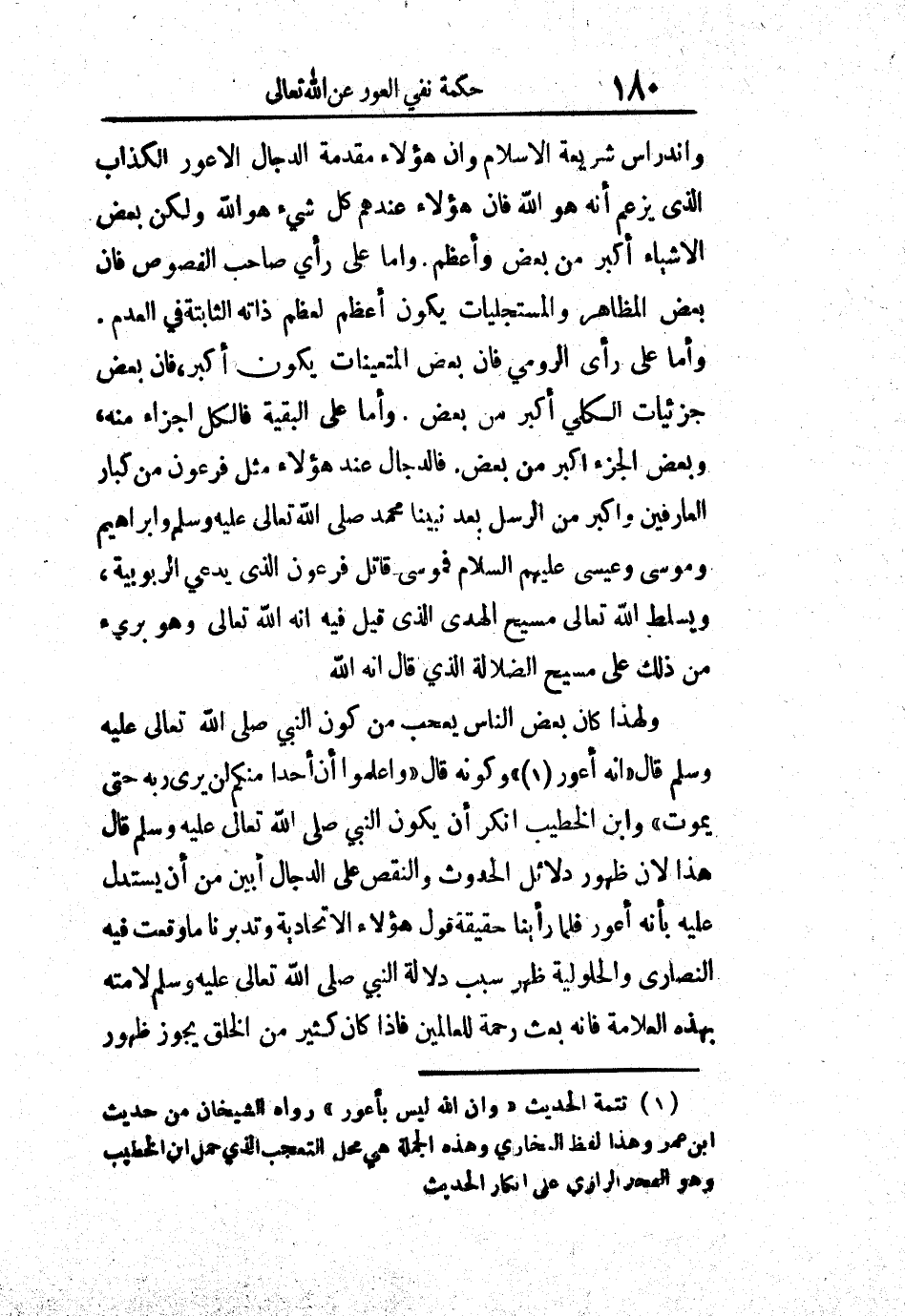 (1) تتمة الحديث " وأن الله ليس بأعور" رواه الشيخان من حديث ابن عمر وهذا لفظ البخاري وهذه الجملة هي محل التعجب الذي حمل ابن الخطيب وهو البحر الرازي على إنكار الحديث