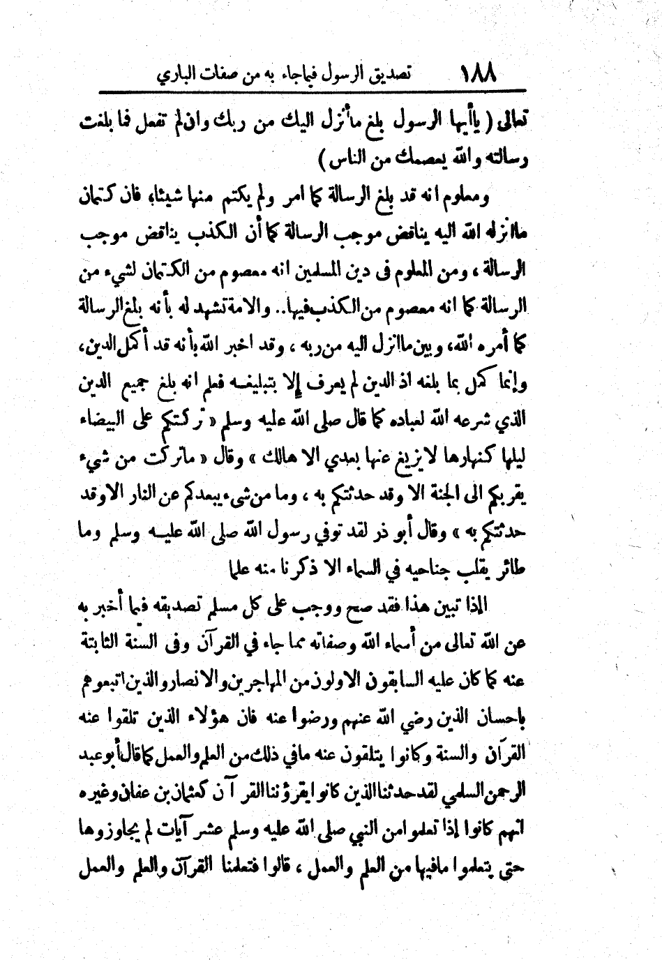فإذا تبين هذا فقد صح ووجب على كل مسلم تصديقه فيما أخبر به عن الله تعالى من أسماء وصفاته مما جاء في القرآن وفي السنة الثابتة عنه كما كان عليه السابقون الأولون من المهاجرين والأنصار والذين اتبعوهم بإحسان الذي رضي الله عنهم ورضوا عنه فإن هؤلاء الذين تلقوا عنه القرآن والسنة وكانوا يتلقون عنه ما في ذلك من العلم والعمل كما قال أبو عبد الرحمن السلمي لقد حدثنا الذين كانوا يقرؤننا القرآن كعثمان بن عفان وغيره أنهم كانوا إذا تعلموا من النبي صلى الله عليه وسلم عشر آيات لم يجاوزوها حتى يتعلموا ما فيها من العلم والعمل، قالوا فتعلمنا القرآن والعلم والعمل