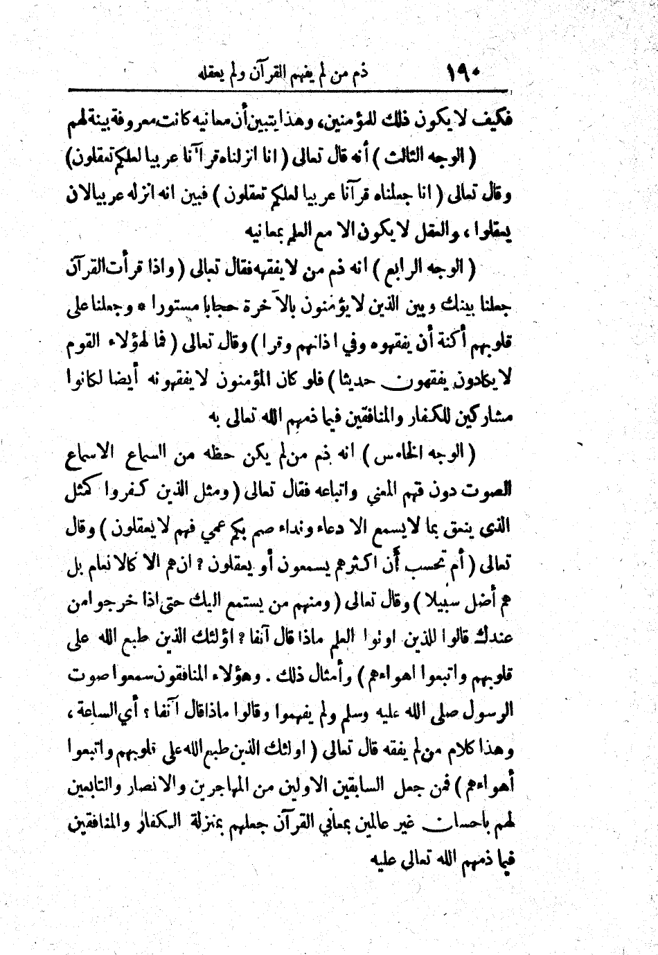 الوجه الرابع: أنه ذم من لا يفقهه فقال تعالى: " وإذا قرأت القرآن جعلنا بينك وبين الذين لا يؤمنون بالآخرة حجاباً مستوراً، وجعلنا على قلوبهم أكنة أن يفقهوه وفي آذانهم وقرا ". وقال تعالى: " فما لهؤلاء القوم لا يكادون يفقهون حديثاً " فلو كان المؤمنون لا يفقهونه أيضاً لكانوا مشاركين للكفار والمنافقين فيما ذمهم الله تعالى به.