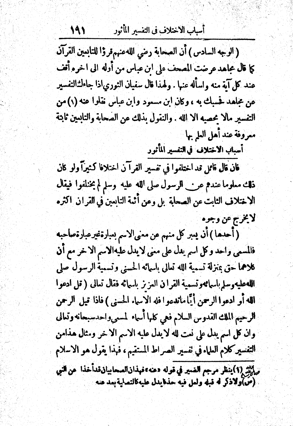 أسباب الاختلاف في التفسير المأثور: فإن قال قائل قد اختلفوا في تفسير القرآن اختلافاً كثيراً ولو كان ذلك معلوماً عندهم عن الرسول صلى الله عليه وسلم ولم يختلفوا فيقال الاختلاف الثابت عن الصحابة بل وعن أئمة التابعين في القرآن أكثره لا يخرج عن وجوه: أحدها: أن يعبر كل منهم عن معنى الاسم بعبارة غير عبارة صاحبه فالمسمى واحد وكل اسم يدل على معنى لا يدل عليه الاسم الأخر مع أن كلاهما حق بمنزلة تسمية الله تعالى بأسمائه الحسنى وتسمية الرسول صلى الله عليه وسلم بأسمائه وتسمية القرآن العزيز بأسمائه فقال تعالى: " قل ادعوا الله أو ادعوا الرحمن أياً ما تدعوا فله الأسماء الحسنى " فإذا قيل الرحمن الرحيم الملك القدوس السلام فهي كلها أسماء لمسمى واحد سبحانه وتعالى وإن كل اسم يدل على نعت لله لا يدل عليه الاسم الآخر ومثال هذا من التفسير كلام العلماء في تفسير الصراط المستقيم، فهذا يقول هو الإسلام