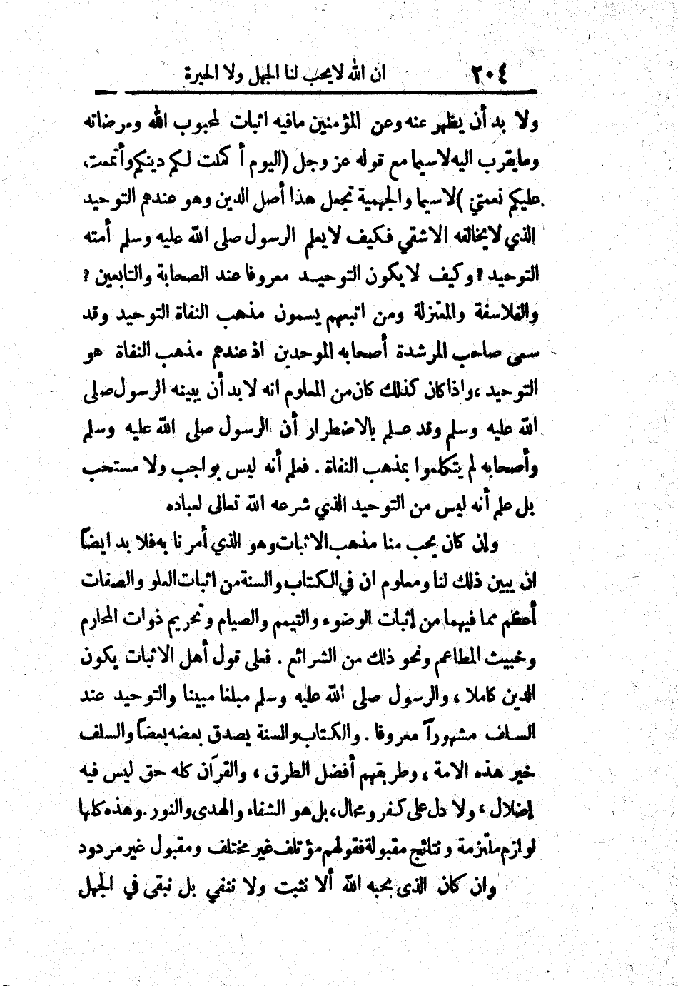 ولا بد أن يظهر عنه وعن المؤمنين ما فيه إثبات لمحبوب الله ومرضاته وما يقرب إليه لا سيما مع قوله عز وجل " اليوم أكملت لكم دينكم وأتممت عليكم نعمتي " لا سيما والجهمية تجعل هذا أصل الدين وهو عندهم التوحيد الذي لا يخالفه إلا شقي فكيف لا يعلم الرسول صلى الله عليه وسلم أمته التوحيد؟ وكيف لا يكون التوحيد معروفاً عند الصحابة والتابعين؟ والفلاسفة والمعتزلة ومن اتبعهم يسمون مذهب النفاة التوحيد وقد سمى صاحب المرشدة أصحابه الموحدين إذ عندهم مذهب النفاة هو التوحيد، وإذا كان كذلك كان من المعلوم أنه لا بد أن يبينه الرسول صلى الله عليه وسلم وقد علم بالاضطرار أن الرسول صلى الله عليه وسلم وأصحابه لم يتكلموا بمذهب النفاة، فعلم أنه ليس بواجب ولا مستحب بل علم أنه ليس من التوحيد الذي شرعه الله تعالى لعباده.