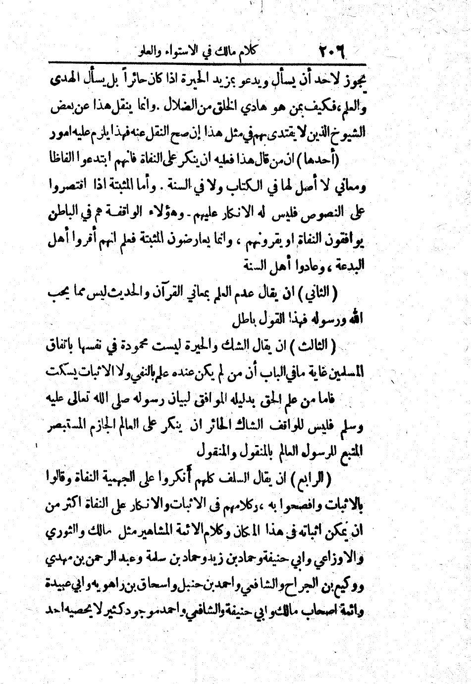 الرابع: أن يقال السلف كلهم أنكروا على الجهمية النفاة وقالوا بالإثبات وأفصحوا به، وكلامهم في الإثبات والإنكار على النفاة أكثر من أن يمكن إثباته في هذا المكان وكلام الأئمة المشاهير مثل مالك والثوري والأوزاعي وأبي حنيفة وحماد بن زيد وحماد بن سلمة وعبد الرحمن بن مهدي ووكيع بن الجراح والشافعي وأحمد بن حنبل وإسحاق بن راهويه وأبي عبيدة وأئمة أصحاب مالك وأبي حنيفة والشافعي وأحمد موجود كثير لا يحصيه أحد.