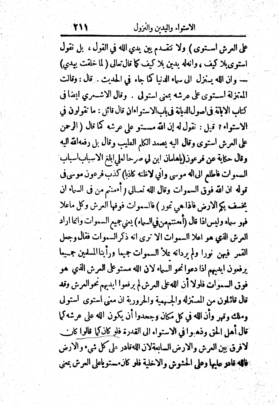 على العرش استوى " ولا نتقدم بين يدي الله في القول، بل نقول استوى بلا كيف، وأنه له يدين بلا كيف كما قال تعالى " لما خلقت بيدي " وأن الله ينزل إلى سماء الدنيا كما جاء في الحديث. قال: وقالت المعتزلة استوى على عرشه بمعنى استولى. وقال الأشعري أيضاً في كتاب الإبانة في أصول الديانة في باب الاستواء إن قال قائل: ما تقولون في الاستواء؟ قيل: نقول له إن الله مستوٍ على عرشه كما قال " الرحمن على العرش استوى " وقال: إليه يصعد الكلم الطيب، وقال بل رفعه الله إليه، وقال حكاية عن فرعون " يا هامان ابن لي صرحاً لعلي أبلغ الأسباب أسباب السموات فأطلع إلى إله موسى وإني لأظنه كاذباً " كذب فرعون موسى في قوله إن الله فوق السموات، وقال الله تعالى: " أأمنتم من في السماء أن يخسف بكم الأرض فإذا هي تمور " فالسموات فوقها العرش، وكل ما علا فهو سماء وليس إذا قال " أأمنتم من في السماء " يعني جميع السموات وإنما أراد العرش الذي هو أعلى السموات ألا ترى أنه ذكر السموات فقال وجعل القمر فيهن نوراً ولم يردانه يملأ السموات جميعاً ورأينا المسلمين جميعاً يرفعون أيديهم إذا دعوا نحو السماء لأن الله مستوٍ على العرش الذي هو فوق السموات فلولا أن الله على العرش لم يرفعوا أيديهم نحو العرش وقد قال قائلون من المعتزلة والجهمية والحرورية أن معنى استوى استولى وملك وقهر وأن الله في كل مكان وجحدوا أن يكون الله على عرشه كما قال أهل الحق وذهبوا في الاستواء إلى القدرة فلو كان كما قالوا كان لا فرق بين العرش والأرض السابعة لأن الله قادر على كل شيء والأرض فالله قادر عليها وعلى الحشوش والأخلية فلو كان مستوياً على العرش بمعنى