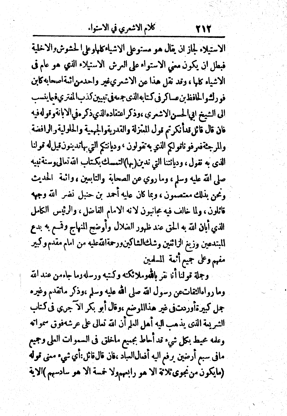 الاستيلاء لجاز أن يقال هو مستوٍ على الأشياء كلها وعلى الحشوش والأخلية فبطل أن يكون معنى الاستواء على العرش الاستيلاء الذي هو عام في الأشياء كلها، وقد نقل هذا عن الأشعري غير واحد من أئمة أصحابه كابن فورك والحافظ بن عساكر في كتابه الذي جمعه في تبيين كذب المفتري فيما ينسب إلى الشيخ أبي الحسن الأشعري، وذكر اعتقاده الذي ذكره في الإبانة وقوله فيه فإن قال قائل قد أنكرتم قول المعتزلة والقدرية والجهمية والحلولية والرافضة والمرجئة فعرفونا قولكم الذي به تقولون، وديانتكم التي بها تدينون قيل له قولنا الذي به نقول، وديانتنا التي ندين بها التمسك بكتاب الله تعالى وسنة نبيه صلى الله عليه وسلم، وما روي عن الصحابة والتابعين، وأئمة الحديث ونحن بذلك معتصمون، وبما كان عليه أحمد بن حنبل نضر الله وجهه قائلون، ولما خالف فيه مجانبون لأنه الإمام الفاضل، والرئيس الكامل الذي أبان الله به الحق عند ظهور الضلال وأوضح المنهاج وقمع به بدع المبتدعين وزيغ الزائغين وشك الشاكين ورحمة الله عليه من إمام مقدم وكبير مفهم على جميع أئمة المسلمين.