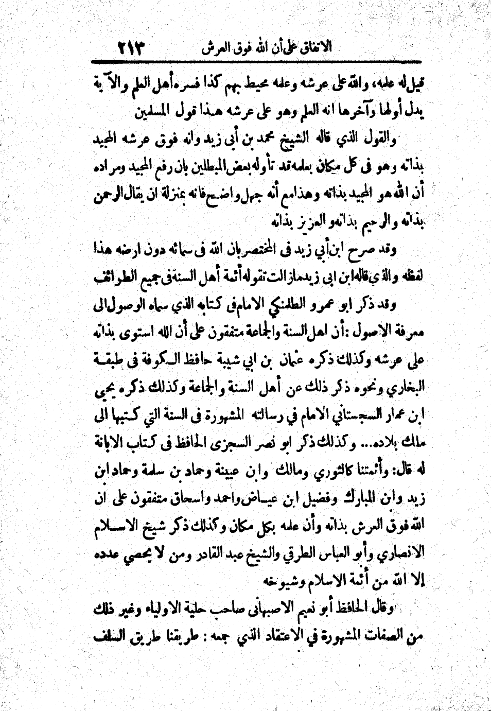 وقد صرح ابن أبي زيد في المختصر بأن الله في سمائه دون أرضه هذا لفظه والذي قاله ابن أبي زيد ما زالت تقوله أئمة أهل السنة في جميع الطوائف وقد ذكر أبو عمرو الطلمنكي الإمام في كتابه الذي سماه الوصول إلى معرفة الأصول: أن أهل السنة والجماعة متفقون على أن الله استوى بذاته على عرشه وكذلك ذكره عثمان بن أبي شيبة حافظ الكوفة في طبقة البخاري ونحوه ذكر ذلك عن أهل السنة والجماعة وكذلك ذكره يحيى بن عمار السجستاني الإمام في رسالته المشهورة في السنة التي كتبها إلى ملك بلاده. . . وكذلك ذكر أبو نصر السجزي الحافظ في كتاب الإبانة له قال: وأئمتنا كالثوري ومالك وابن عيينة وحماد بن سلمة وحماد بن زيد وابن المبارك وفضيل بن عياض وأحمد وإسحاق متفقون على أن الله فوق العرش بذاته وأن علمه بكل مكان وكذلك ذكر شيخ الإسلام الأنصاري وأبو العباس الطرقي والشيخ عبد القادر ومن لا يحصي عدده إلا الله من أئمة الإسلام وشيوخه.