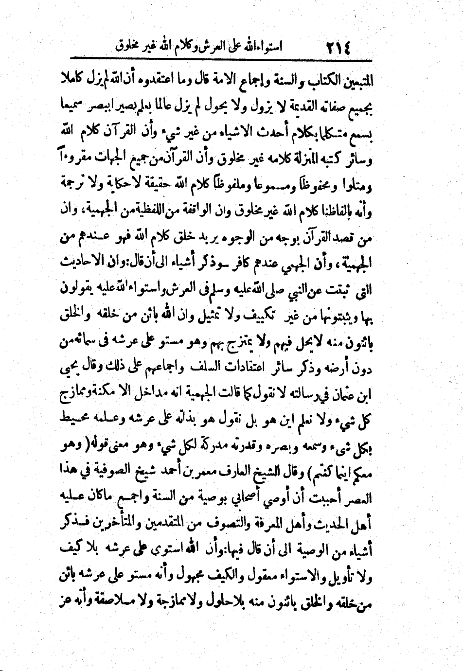 المتبعين الكتاب والسنة وإجماع الأمة، قال: وما اعتقدوه أن الله لم يزل كاملاً بجميع صفاته القديمة لا يزول ولا يحول لم يزل عالماً بعلم بصير أيبصر سميعاً يسمع متكلماً بكلام أحدث الأشياء من غير شيء وأن القرآن كلام الله وسائر كتبه المنزلة كلامه غير مخلوق وأن القرآن من جميع الجهات مقروءاً ومتلواً ومحفوظاً ومسموعاً وملفوظاً كلام الله حقيقة لا حكاية ولا ترجمة وأنه بألفاظنا كلام الله غير مخلوق وأن الواقفة من اللفظية من الجهمية، وإن من قصد القرآن بوجه من الوجوه يريد خلق كلام الله فهو عندهم من الجهمية، وأن الجهمي عندهم كافر - وذكر أشياء إلى أن قال: وإن الأحاديث التي ثبتت عن النبي صلى الله عليه وسلم في العرش واستواء الله عليه يقولون بها ويثبتونها من غير تكييف ولا تمثيل وأن الله بائن من خلقه والخلق بائنون منه لا يحل فيهم ولا يمتزج بهم وهو مستوٍ على عرشه في سمائه من دون أرضه وذكر سائر اعتقادات السلف وإجماعهم على ذلك وقال يحيى بن عثمان في رسالته: لا نقول كما قالت الجهمية إنه مداخل الأمكنة وممازج كل شيء ولا نعلم أين هو بل نقول هو بذاته على عرشه وعلمه محيط بكل شيء وسمعه وبصره وقدرته مدركة لكل شيء وهو معنى قوله: " وهو معكم أينما كنتم ".