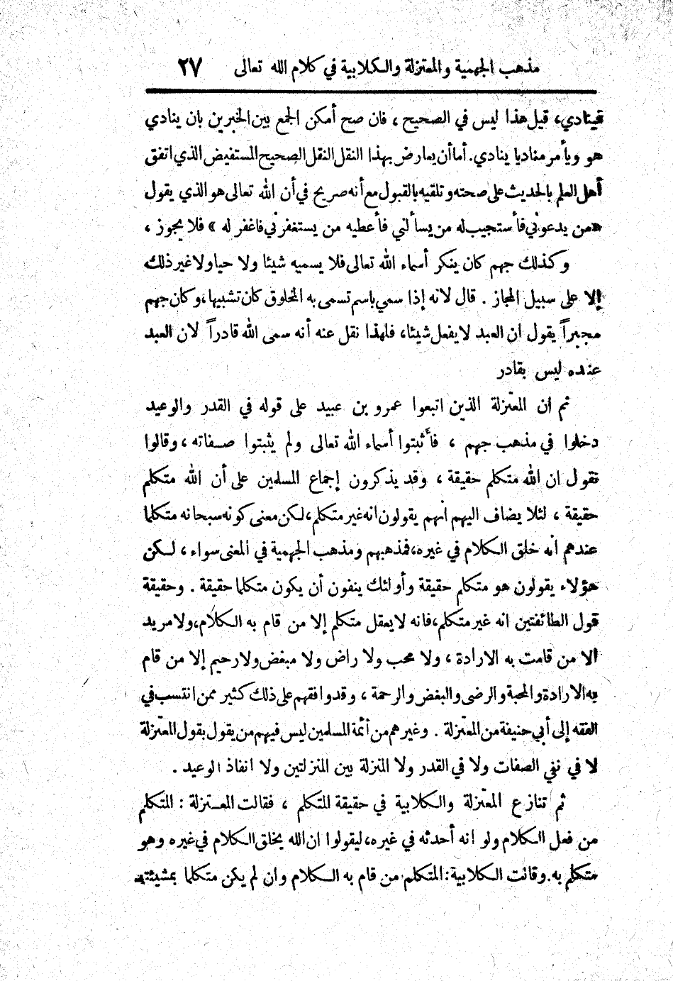 ثم إن المعتزلة الذين اتبعوا عمرو بن عبيد على قوله في القدر والوعيد دخلوا في مذهب جهم، فأثبتوا أسماء الله تعالى ولم يثبتوا صفاته، وقالوا نقول أن الله متكلم حقيقة، وقد يذكرون إجماع المسلمين على أن الله متكلم حقيقة، لئلا يضاف إليهم أنهم يقولون أنه غير متكلم، لكن معنى كونه سبحانه متكلماً عندهم أنه خلق الكلام في غيره، فمذهبهم ومذهب الجهمية في المعنى سواء، لكن هؤلاء يقولون هو متكلم حقيقة وأولئك ينفون أن يكون متكلماً حقيقة. وحقيقة قول الطائفتين أنه غير متكلم، فإنه لا يعقل متكلم إلا من قام به الكلام، ولا مريد إلا من قامت به الإرادة، ولا محب ولا راض ولا مبغض ولا رحيم إلا من قام به الإرادة والمحبة والرضى والبغض والرحمة، وقد وافقهم على ذلك كثير ممن انتسب في الفقه إلى أبي حنيفة من المعتزلة، وغيرهم من أئمة المسلمين ليس فيهم من يقول بقول المعتزلة لا في نفي الصفات ولا في القدر ولا المنزلة بين المنزلتين ولا إنفاذ الوعيد.