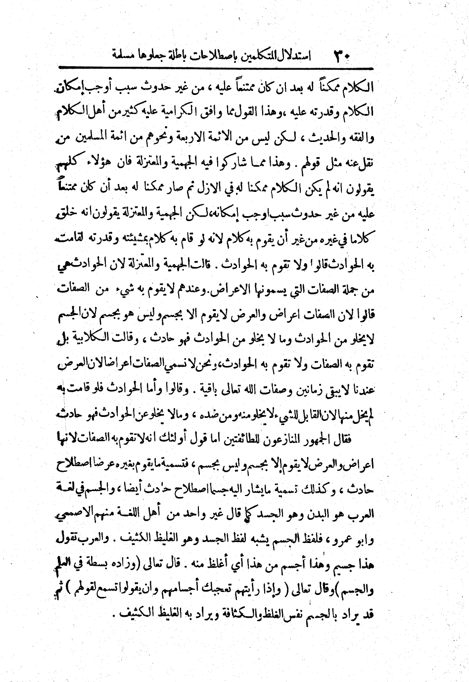 الكلام ممكناً بعد أن كان ممتنعاً عليه، من غير حديث سبب أوجب إمكان الكلام وقدرته عليه، وهذا القول مما وافق الكرامية عليه كثير من أهل الكلام والفقه والحديث، لكن ليس من الأئمة الأربعة ونحوهم من أئمة المسلمين من نقل عنه مثل قولهم. وهذا مما شاركوا فيه الجهمية والمعتزلة فإن هؤلاء كلهم يقولون أنه لم يكن الكلام ممكناً له في الأزل ثم صار ممكناً له بعد أن كان ممتنعاً عليه من غير حدوث سبب أوجب إمكانه لكن الجهمية والمعتزلة يقولون أنه خلق كلاماً في غيره من غير أن يقوم به كلام لأنه لو قام به كلام بمشيئته وقدرته لقامت به الحوادث قالوا: ولا تقوم به الحوادث، قالت الجهمية والمعتزلة لأن الحوادث هي من جملة الصفات التي يسمونها الأعراض، وعندهم لا يقوم به شيء من الصفات قالوا لأن الصفات أعراض والعرض لا يقوم إلا بجسم وليس هو بجسم لأن الجسم لا يخلو من الحوادث فهو حادث، وقالت الكلابية: بل تقوم به الصفات ولا تقوم به الحوادث، ونحن لا نسمي الصفات أعراضاً لأن العرض عندنا لا يبقى زمانين وصفات الله تعالى باقية، وقالوا وأما الحوادث فلو قامت به لم يخل منها لأن القابل للشيء لا يخلو منه ومن ضده، وما لا يخلو عن الحوادث فهو حادث.