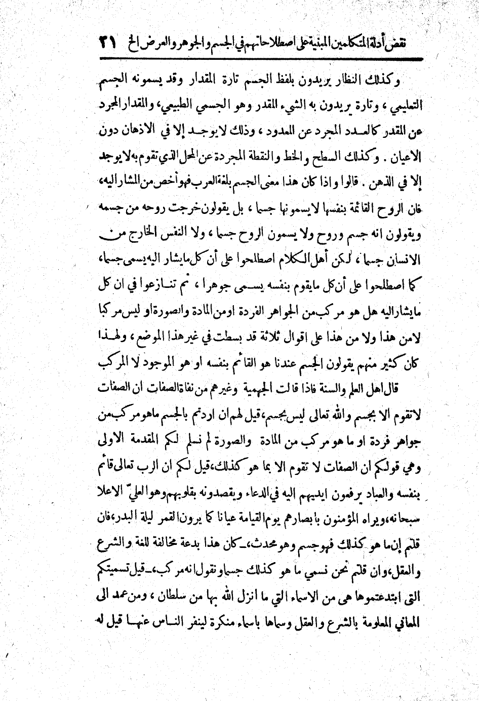 وكذلك النظار يريدون بلفظ الجسم تارة المقدار وقد يسمونه الجسم التعليمي، وتارة يريدون به الشيء المقدر وهو الجسمي الطبيعي، والمقدار المجرد عن المقدر كالعدد المجرد عن المعدود، وذلك لا يوجد إلا في الأذهان دون الأعيان. وكذلك السطح والخط والنقطة المجردة عن المحل الذي تقوم به لا يوجد إلا في الذهن. قالوا وإذا كان هذا معنى الجسم بلغة العرب فهو أخص من المشار إليه، فإن الروح القائمة بنفسها لا يسمونها جسماً، بل يقولون خرجت روحه من جسمه ويقولون إنه جسم وروح ولا يسمون الروح جسماً، ولا النفس الخارج من الإنسان جسماً، لكن أهل الكلام اصطلحوا على أن كل ما يشار إليه يسمى جسماً، كما اصطلحوا على أن كل ما يقوم بنفسه جوهراً، ثم تنازعوا في أن كل ما يشار إليه هل هو مركب من الجواهر الفردة أو من الماردة والصورة أو ليس مركباً لا من هذا ولا من هذا على أقوال ثلاثة قد بسطت في غير هذا الموضع، ولهذا كان كثير منهم يقولون الجسم عندنا هو القائم بنفسه أو هو الموجود لا المركب.