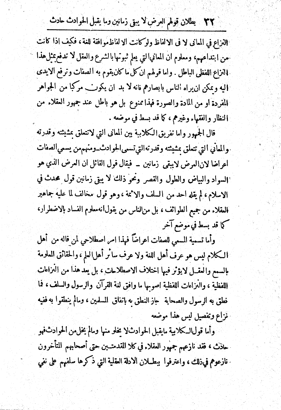 قال الجمهور وإما تفريق الكلابية بين المعاني التي لا تتعلق بمشيئته وقدرته والمعاني التي تتعلق بمشيئته وقدرته التي تسمى الحوادث - ومنهم من يسمي الصفات أعراضاً لأن العرض لا يبقى زمانين - فيقال قول القائل أن العرض الذي هو السواد والبياض والطول والقصر ونحو قول محدث في الإسلام، لم يقله أحد من السلف والأئمة، وهو قول مخالف لما عليه جماهير العقلاء من جميع الطوائف، بل من الناس من يقول أنه معلوم الفساد بالاضطرار، كما قد بسط في موضع آخر.