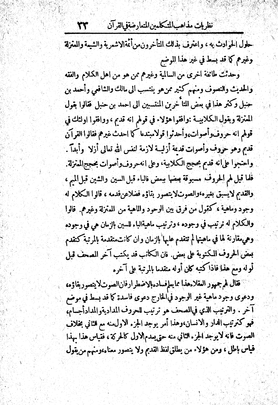 وحدثت طائفة أخرى من السالمية وغيرهم ممن هو من أهل الكلام والفقه والحديث والتصوف ومنهم كثير ممن هو ينتسب إلى مالك والشافعي وأحمد بن حنبل وكثر هذا في بعض المتأخرين المنتسبين إلى أحمد بن حنبل فقالوا بقول المعتزلة وبقول الكلابية: وافقوا هؤلاء في قولهم أنه قديم، ووافقوا أولئك في قولهم أنه حروف وأصوات، وأحدثوا قولاً مبتدعاً كما أحدث غيرهم فقالوا القرآن قديم وهو حروف وأصوات قديمة أزلية لازمة لنفس الله تعالى أزلاً وأبداً. واحتجوا على أنه قديم بحجج الكلابية، وعلى أنه حروف وأصوات بحجج المعتزلة. فلما قيل لهم الحروف مسبوقة بعضها ببعض فالباء قبل السين والشين قبل الميم، والقديم لا يسبق بغيره، والصوت لا يتصور بقاؤه فضلاً عن قدمه، قالوا الكلام له وجود وماهية، كقول من فرق بين الوجود والماهية من المعتزلة وغيرهم. قالوا: والكلام له ترتيب في وجوده، وترتيب ماهية الباء للسين بالزمان هي في وجوده وهي مقارنة لها في ماهيتها لم تتقدم عليها بالزمان وإن كانت متقدمة بالمرتبة كتقدم بعض الحروف المكتوبة على بعض، فإن الكاتب قد يكتب آخر المصحف قبل أوله ومع هذا فإذا كتبه كان أوله متقدماً بالمرتبة على آخره.