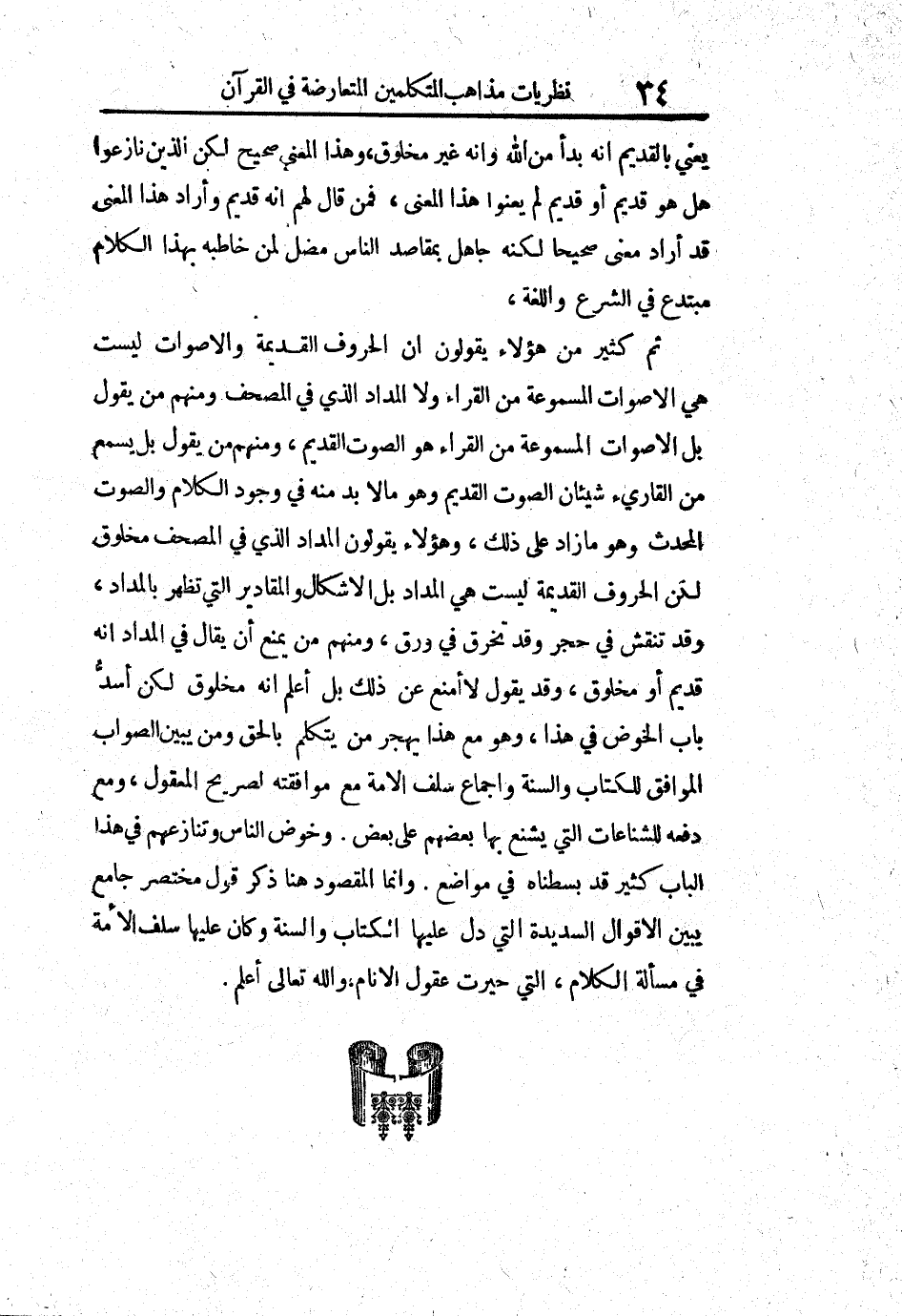 ثم كثير من هؤلاء يقولون أن الحروف القديمة والأصوات ليست هي الأصوات المسموعة من القراء ولا المداد الذي في المصحف ومنهم من يقول بل الأصوات المسموعة من القراء هو الصوت القديم، ومنهم من يقول بل يسمع من القارئ شيئان الصوت القديم وهو ما لا بد منه في وجود الكلام والصوت المحدث وهو ما زاد على ذلك، وهؤلاء يقولون المداد الذي في المصحف مخلوق لكن الحروف القديمة ليست هي المداد بل الأشكال والمقادير التي تظهر بالمداد، وقد تنقش في حجر وقد تخرق في ورق، ومنهم من يمنع أن يقال في المداد أنه قديم أو مخلوق، وقد يقول لا أمنع عن ذلك بل أعلم أنه مخلوق لكن أسد باب الخوض في هذا، وهو مع هذا من يتكلم بالحق ومن يبين الصواب الموافق للكتاب والسنة وإجماع سلف الأمة مع موافقته لصريح المعقول، ومع دفعه للشناعات التي يشنع بها بعضهم على بعض، وخوض الناس وتنازعهم في هذا الباب كثير قد بسطناه في مواضع، وإنما المقصود هنا ذكر قول مختصر جامع يبين الأقوال السديدة التي دل عليها الكتاب والسنة وكان عليها سلف الأمة في مسألة الكلام، التي حيرت عقول الأنام، والله تعالى أعلم.