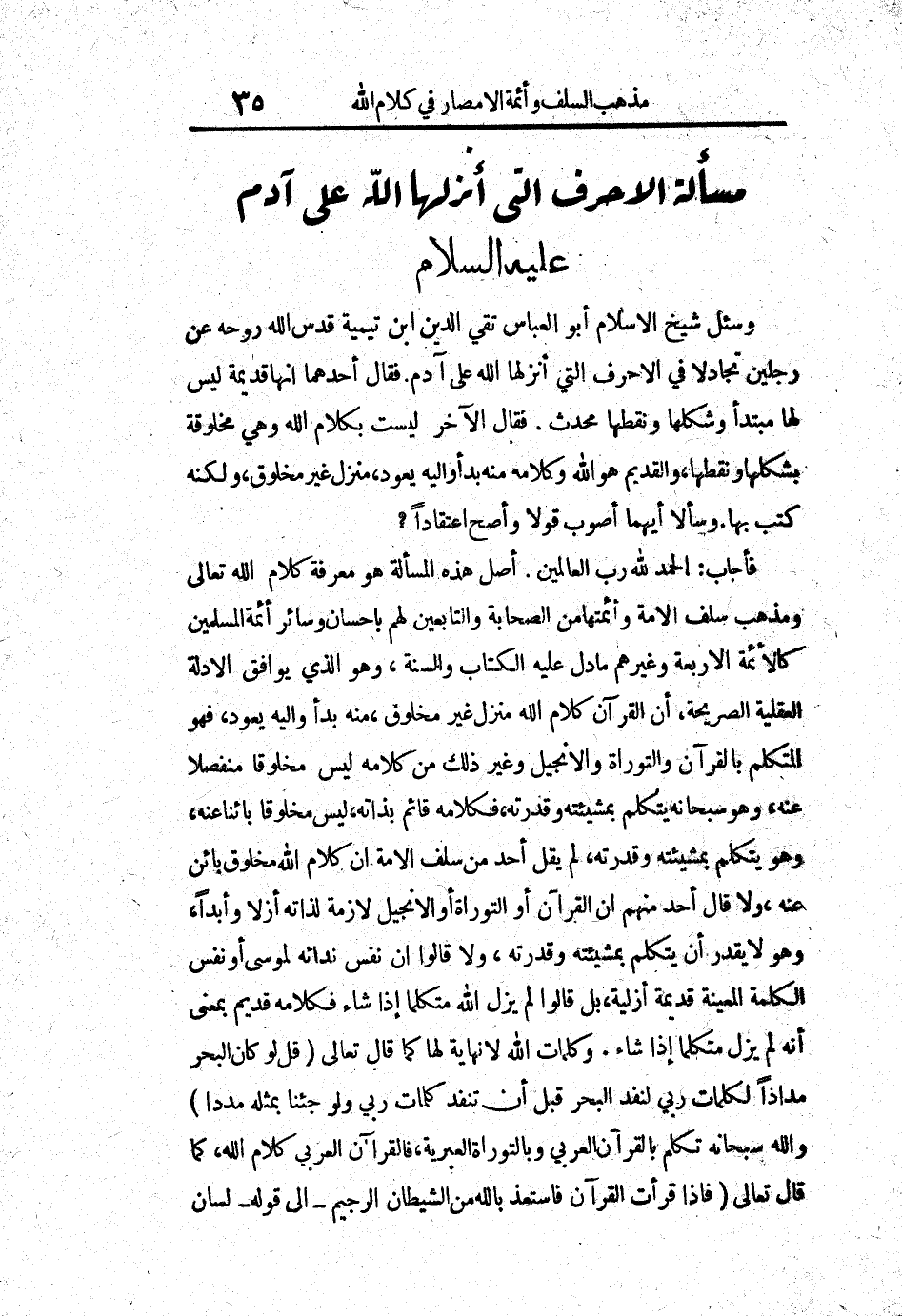 وسئل شيخ الإسلام أبو العباس تقي الدين ابن تيمية قدس الله روحه عن رجلين تجادلا في الأحرف التي أنزلها الله على آدم، فقال أحدهما: إنهما قديمة ليس لها مبتدأ وشكلها ونقطها محدث. فقال الآخر ليست بكلام الله وهي مخلوقة بشكلها ونقطها، والقديم هو الله وكلامه منه بدأ وإليه يعود، منزل غير مخلوق، ولكنه كتب بها، وسألا أيهما أصوب قولاً وأصح اعتقاداً؟ فأجاب: