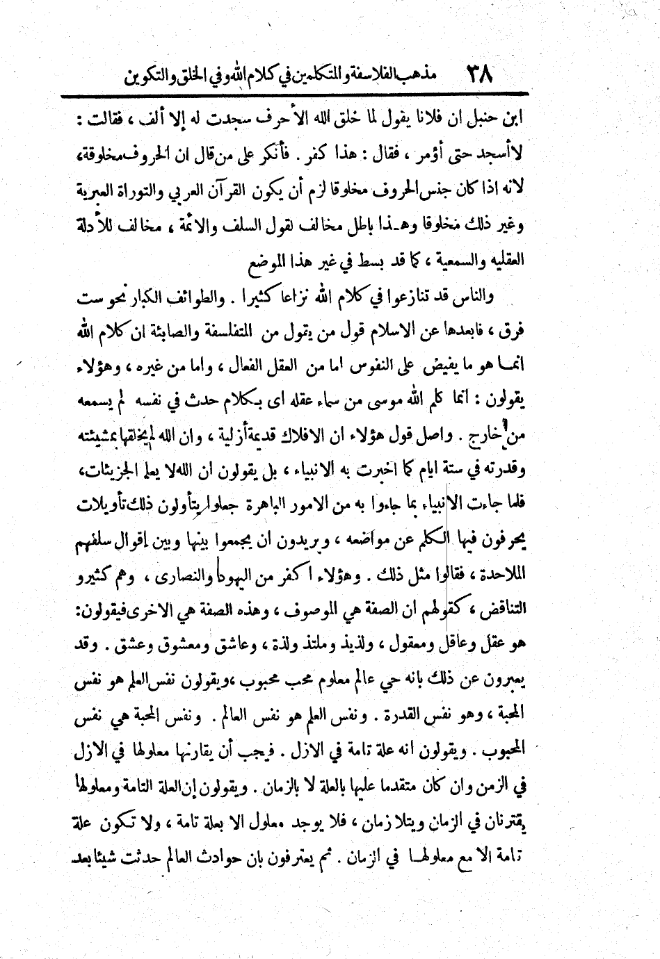 بن حنبل أن فلاناً يقول لما خلق الله الأحرف سجدت له إلا ألف، فقالت: لا أسجد حتى أؤمر، فقال: هذا كفر. فأنكر على من قال أن الحروف مخلوقة، لأنه إذا كان جنس الحروف مخلوقاً لزم أن يكون القرآن العربي والتوراة العبرية وغير ذلك مخلوقاً وهذا باطل مخالف لقول السلف والأئمة، مخالف للأدلة العقلية والسمعية، كما قد بسط في غير هذا الموضع.