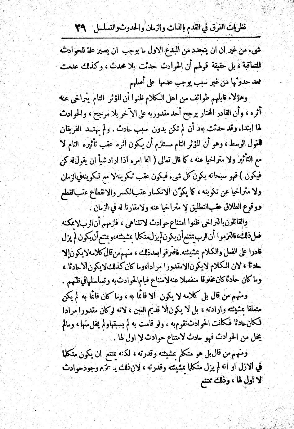 وهؤلاء قابلهم طوائف من أهل الكلام ظنوا أن المؤثر التام يتراخى عنه أثره، وأن القادر المختار يرجح أحد مقدوريه على الآخر بلا مرجح، والحوادث لها ابتداء وقد حدثت بعد أن لم تكن بدون سبب حادث، ولم يهتد الفريقان للقول الوسط، وهو أن المؤثر التام مستلزم أن يكون أثره عقب تأثيره التام لا مع التأثير ولا متراخياً عنه، كما قال تعالى: " إنما أمره إذا أراد شيئاً أن يقول له كن فيكون " فهو سبحانه يكون كل شيء فيكون عقب تكوينه لا مع تكوينه في الزمان ولا متراخياً عن تكوينه، كما يكون الانكسار عقب الكسر والانقطاع عقب القطع ووقوع الطلاق عقب التطليق لا متراخياً عنه ولا مقارناً له في الزمان.