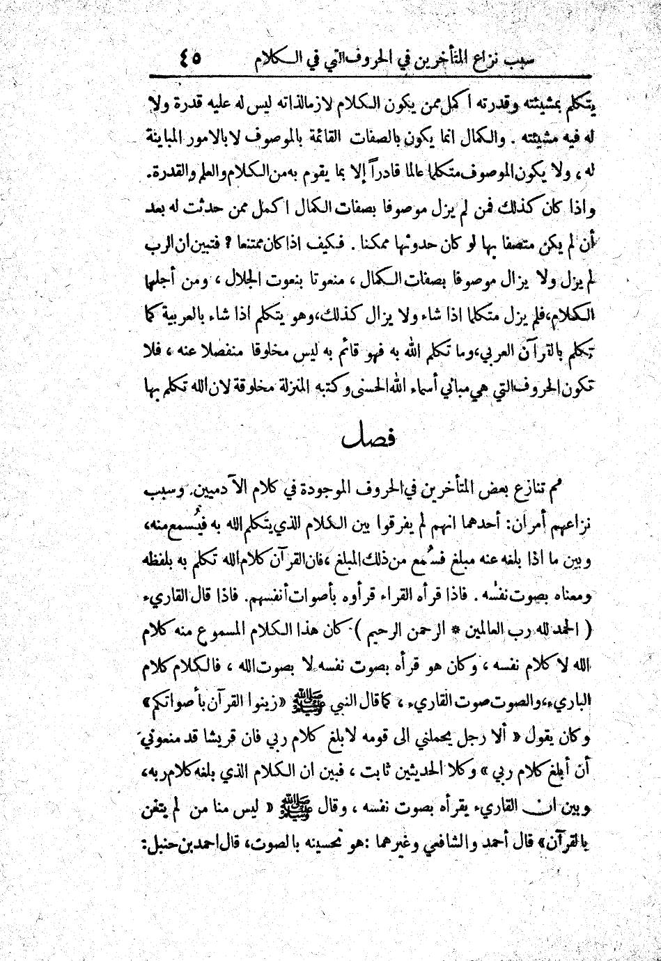 فصل: ثم تنازع بعض المتأخرين في الحروف الموجودة في كلام الآدميين، وسبب نزاعهم أمران: أحدهما أنهم لم يفرقوا بين الكلام الذي يتكلم الله به فيسمع منه، وبين ما إذا بلغه عنه مبلغ فسمع من ذلك المبلغ، فإن القرآن كلام الله تكلم به بلفظه ومعناه بصوت نفسه، فإذا قرأه القراء قرؤوه بأصوات أنفسهم. فإذا قال القارئ " الحمد لله رب العالمين، الرحمن الرحيم " كان هذا الكلام المسموع منه كلام الله لا كلام نفسه، وكان هو قرأه بصوت نفسه لا بصوت الله، فالكلام كلام البارئ، والصوت صوت القارئ، كما قال النبي صلى الله عليه وسلم: " زينوا القرآن بأصواتكم " وكان يقول: " ألا رجل يحملني إلى قومه لأبلغ كلام ربي فإن قريشاً قد منعوني أن أبلغ كلام ربي " وكلا الحديثين ثابت، فبين أن الكلام الذي بلغه كلام ربه وبين أن القارئ يقرأه بصوت نفسه، وقال صلى الله عليه وسلم: " ليس منا من لم يتغن بالقرآن " قال أحمد والشافعي وغيرهما: هو تحسينه بالصوت، قال أحمد بن حنبل: