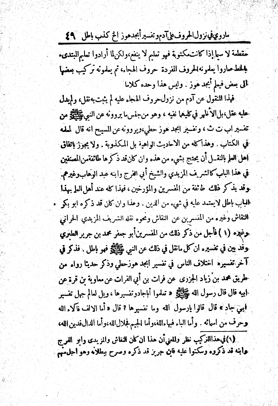 فهذا المنقول عن آدم من نزول حروف الهجاء عليه لم يثبت به نقل، ولم يدل عليه عقل، بل الأظهر في كليهما نفيه، وهو من جنس ما يروونه عن النبي صلى الله عليه وسلم من تفسير اب ت ث، وتفسير أبجد هوز حطي، ويروونه عن المسيح أنه قال لمعلمه في الكتاب، وهذا كله من الأحاديث الواهية بل المكذوبة، ولا يجوز باتفاق أهل العلم بالنقل أن يحتج بشيء من هذه وإن كان قد ذكرها طائفة من المصنفين في هذا الباب كالشريف المزيدي والشيخ أبي الفرج وابنه عبد الوهاب وغيرهم، وقد يذكر ذلك طائفة من المفسرين والمؤرخين، فهذا كله عند أهل العلم بهذا الباب باطل لا يعتمد عليه في شيء من الدين، وهذا وإن كان قد ذكره أبو بكر النقاش وغيره من المفسرين عن النقاش ونحوه نقله الشريف المزيدي الحراني وغيره (1) فأجل من ذكر ذلك من المفسرين أبو جعفر محمد بن جرير الطبري وقد بين في تفسيره أن كل ما نقل في ذلك عن النبي صلى الله عليه وسلم فهو باطل، فذكر في آخر تفسيره اختلاف الناس في تفسير أبجد هوز حطي، وذكر حديثاً رواه من طريق محمد بن زياد الجزري عن فرات ابن أبي الفرات عن معاوية بن قرة عن أبيه قال: قال رسول الله صلى الله عليه وسلم: " تعلموا أبا جاد وتفسيرها، ويل لعالم جهل تفسير أبي جاد " قال: قالوا يا رسول الله وما تفسيرها؟ قال: " أما الألف فآلاء الله وحرف من أسمائه، وأما الباء فبهاء الله، وأم الجيم فجلال الله، وأما الدال فدين الله،