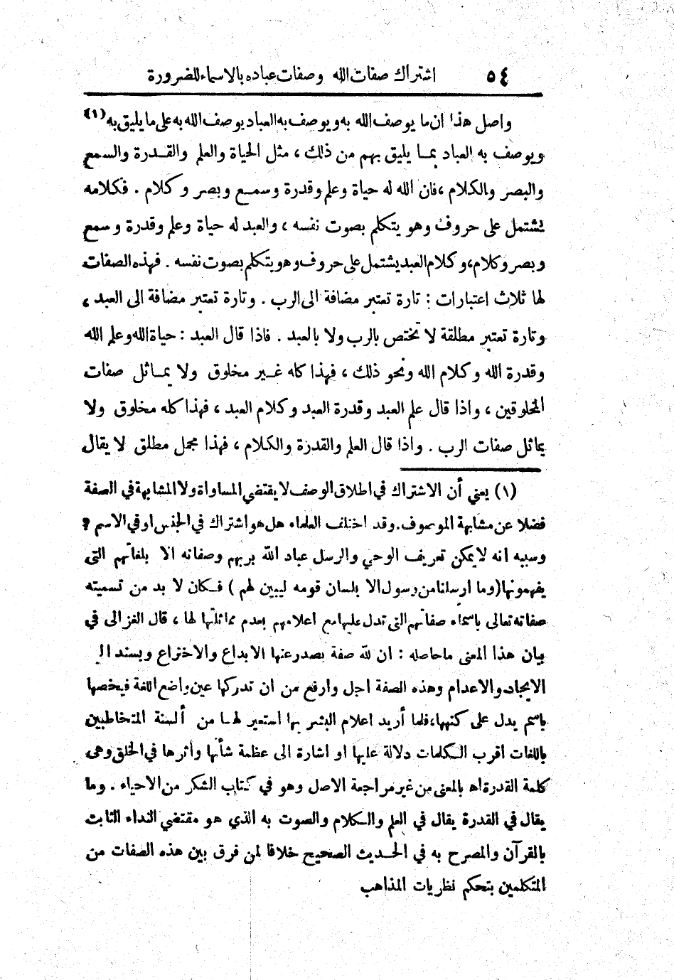 (1) يعني أن الاشتراك في اطلاق الوصف لا يقتضي المساواة ولا المشابهة في الصفة فضلا عن مشابهة الموصوف. وقد اختلف العلماء هل هو اشتراك في الجنس أو في الاسم؟ وسببه أنه لا يمكن تعريف الوحي والرسل عباد الله بربهم وصفاته إلا بلغاتهم التي يفهمونها (وما أرسلنا من رسول إلا بلسان قومه ليبين لهم) فكان لابد من تسميته صفاته تعالى باسماء صفاتهم التي تدل عليها مع إعلامهم بعدم مماثلتها لها، قال الغزالي في بيان هذا المعنى ما حاصله: أن الله صفة يصدر عنها الإبداع والاختراع وبسند إلخ. الإيجاد والإعدام وهذه الصفة أجل وأرفع من أن تدركها عين واضع اللغة فيخصها باسم يدل على كنهها، فلما أريد أعلام البشر بها استعير لها من ألسنة المتخاطبين باللغات أقرب الكلمات دلالة عليها أو اشارة إلى عظمة شأنها وأثرها في الخلق وهي كلمة القدرة بالمعنى من غير مراجعة الأصل وهو في كتاب الشكر من الاحياء. وما يقال في القدرة في العلم والكلام والصوت به الذي هو مقتضى النداء الثابت بالقرآن والمصرح به في الحديث الصحيح خلافا لمن فرق بين هذه الصفات من المتكلمين بتحكم نظريات المذاهب