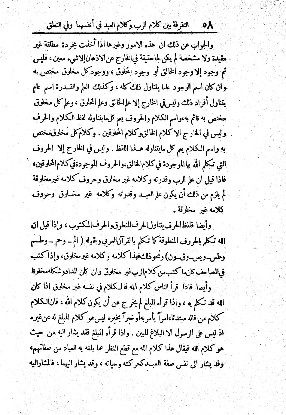 والجواب عن ذلك أن هذه الأمور وغيرها إذا أخذت مجردة مطلقة غير مقيدة ولا مشخصة لم يكن لها حقيقة في الخارج عن الأذهان إلا شيء معين، فليس ثم وجود إلا وجود الخالق أو وجود المخلوق، ووجود كل مخلوق مختص مختص به وإن كان اسم الوجود عاماً يتناول ذلك كله، وكذلك العلم والقدرة اسم عام يتناول أفراد ذلك وليس في الخارج إلا علم الخالق وعلم المخلوق، وعلم كل مخلوق مختص به قائم به، واسم الكلام والحروف يعم كل ما يتناوله لفظ الكلام والحرف وليس في الخارج إلا كلام الخالق وكلام المخلوقين، وكلام كل مخلوق مختص به واسم الكلام يعم كل ما يتناوله هذا اللفظ، وليس في الخارج إلا الحروف التي تكلم الله بها الموجودة في كلام الخالق، والحروف الموجودة في كلام المخلوقين، فإذا قيل إن علم الرب وقدرته وكلامه غير مخلوق وحروف كلامه غير مخلوقة لم يلزم من ذلك أن يكون علم العبد وقدرته وكلامه غير مخلوق وحروف كلامه غير مخلوقة.