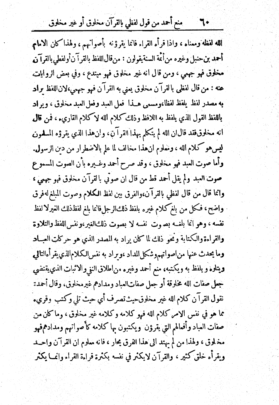 وأما صوت العبد فهو مخلوق، وقد صرح أحمد وغيره بأن الصوت المسموع صوت العبد ولم يقل أحمد قط: من قال إن صوتي بالقرآن مخلوق فهو جهمي، وإنما قال: من قال لفظي بالقرآن، والفرق بين لفظ الكلام وصوت المبلغ له فرق واضح، فكل من بلغ كلام غيره بلفظ ذلك الرجل فإنما بلغ لفظ ذلك الغير لا لفظ نفسه، وهو إنما بلغه بصوت نفسه لا بصوت ذلك الغير، ونفس اللفظ والتلاوة والقراءة والكتابة ونحو ذلك لما كان يراد به المصدر الذي هو حركات العباد وما يحدث عنها من أصواتهم وشكل المداد، ويراد به نفس الكلام الذي يقرأه التالي ويتلوه ويلفظ به ويكتبه، منع أحمد وغيره من إطلاق النفي الإثبات الذي يقتضي جعل صفات الله مخلوقة أو جعل صفات العباد ومدادهم غير مخلوق، وقال أحمد: نقول القرآن كلام الله غير مخلوق حيث تصرف أي حيث تلي وكتب وقرئ مما هو في نفس الأمر كلام الله فهو كلامه وكلامه غير مخلوق، وما كان من صفات العباد وأفعالهم التي يقرؤون ويكتبون بها كلامه كأصواتهم ومدادهم فهو مخلوق، ولهذا لم يهتد إلى هذا الفرق يحار، فإنه معلوم أن القرآن واحد ويقرأه خلق كثير، والقرآن لا يكثر في نفسه بكثرة القراء وإنما يكثر