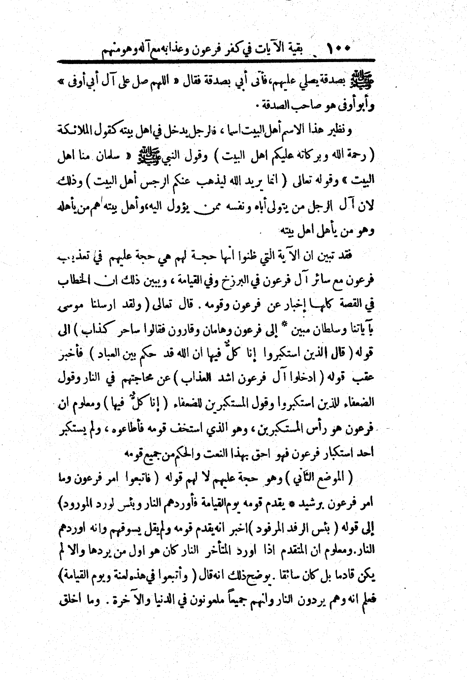 فقد تبين أن الآية التي ظنوا أنها حجة لهم هي حجة عليهم في تعذيب فرعون ما سائر آل فرعون في البرزخ وفي القيامة، ويبين ذلك أن الخطاب في القصة كلها إخبار عن فرعون وقومه. قال تعالى (ولقد أرسلنا موسى بآياتنا وسلطان مبين، إلى فرعون وهامان وقارون فقالوا ساحر كذاب) إلى قوله (قال الذين استكبروا إنا كل فيها أن الله قد حكم بين العباد) فأخبر عقب قوله (ادخلوا آل فرعون أشد العذاب) عن محاجتهم في النار وقول الضعفاء للذين استكبروا وقول المستكبرين للضعفاء (إنا كل فيها) ومعلوم أن فرعون هو رأس المستكبرين، وهو الذي استخف قومه فأطاعوه، ولم يستكبر أحد استكبار فرعون فهو أحق بهذا النعت والحكم من جميع قومه.