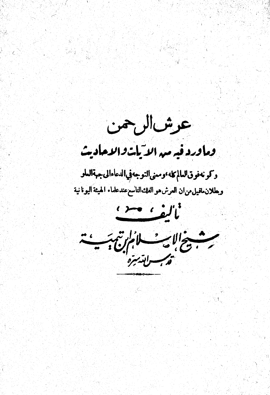 وكونه فوق العالم كله، ومعنى التوجه في الدعاء إلى جهة العلو وبطلان ما قيل من أن العرش هو الفلك التاسع عند علماء الهيئة اليونانية تأليف شيخ الإسلام ابن تيمية قدس سره