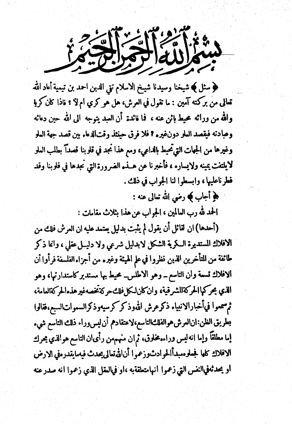 بسم الله الرحمن الرحيم سئل شيخنا وسيدنا شيخ الإسلام تقي الدين أحمد بن تيمية أعاد الله تعالى من بركته آمين: ما تقول في العرش، هل هو كري أم لا؟ فإذا كان كرياً والله من ورائه محيط بائن عنه، فما فائدة أن العبد يتوجه إلى الله حين دعائه وعبادته فيقصد العلو دون غيره؟ فلا فرق حينئذ وقت الدعاء بين قصد جهة العلو وغيرها من الجهات التي تحيط بالداعي، ومع هذا نجد في قلوبنا قصداً بطلب العلو لا يلتفت يمينه ولا يساره، فأخبرنا عن هذه الضرورة التي نجدها في قلوبنا وقد فطرنا عليها، وابسطوا لنا الجواب في ذلك.