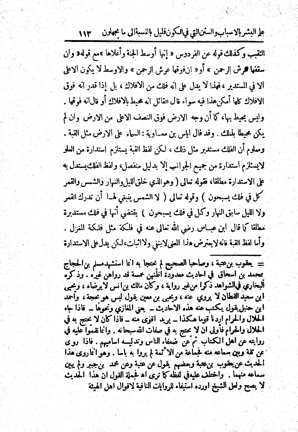 التقبب وكذلك قوله عن الفردوس " إنها أوسط الجنة وأعلاها " مع قوله " وإن سقفها عرش الرحمن " أو " إن فوقها عرش الرحمن " والأوسط لا يكون الأعلى إلا في المستدير، فهذا لا يدل على أنه فلك من الأفلاك، بل إذا قدر أنه فوق الأفلاك كلها أمكن هذا فيه سواء قال القائل أنه محيط بالأفلاك أو قال أنه فوقها. وليس يحيط بها، كما أن وجه الأرض فوق النصف الأعلى من الأرض مثل القبة. ومعلوم أن الفلك مستدير مثل ذلك، لكن لفظ القبة يستلزم استدارة من العلوم لا يستلزم استدارة من جميع الجوانب إلا بدليل منفصل، ولفظ الفلك يستدل به على الاستدارة مطلقاً، فقوله تعالى (وهو الذي خلق الليل والنهار والشمس والقمر كل في فلك يسبحون) وقوله تعالى (لا الشمس ينبغي لها أن تدرك القمر ولا الليل سابق النهار وكل في فلك يسبحون) يقتضي أنها في فلك مستديرة مطلقاً كما قال ابن عباس رضي الله تعالى عنه في فلكة مثل فلكة المغزل. وأما لفظ القبة فإنه لا يعترض هذا المعنى لا بنفي ولا إثبات، لكن يدل على الاستدارة