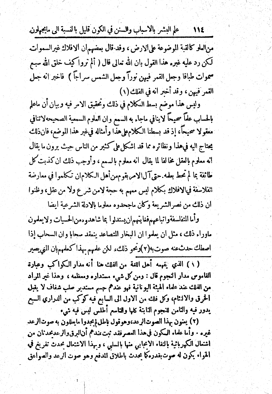 (1) الذي يفهمه أهل اللغة من الفلك هنا أنه مدار الكواكب وعبارة القاموس مدار النجوم قال: ومن كل شيء مستداره ومعظمه، وهذا غير المراد من الفلك عند الهيئة اليونانية فهو عندهم جسم مستدير صلب شفاف لا يقبل الخرق والالتئام، وكل فلك من الأول إلى السابع فيه كوكب من الدراري السبع يدور فيه والثامن للنجوم الثابتة كلها والتاسع أطلس ليس فيه شيء