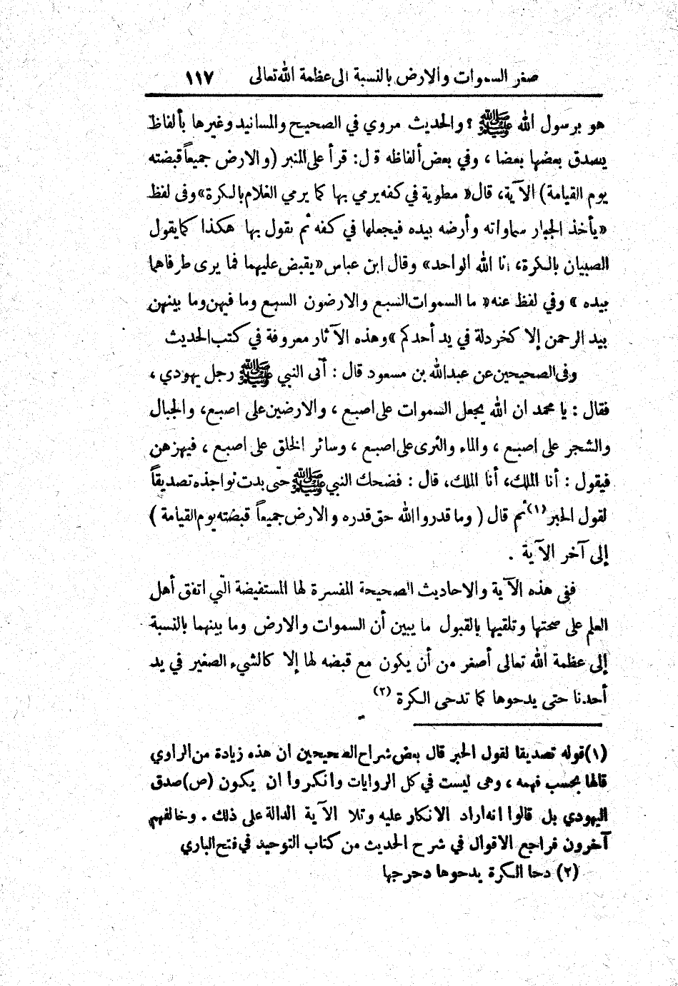 ففي هذه الآية والأحاديث الصحيحة المفسرة لها المستفيضة التي اتفق أهل العلم على صحتها وتلقيها بالقبول ما يبين أن السموات والأرض وما بينهما بالنسبة إلى عظمة الله تعالى أصغر من أن يكون مع قبضه لها إلا كالشيء الصغير في يد أحدنا حتى يدحوها كما تدحى الكرة. (2)