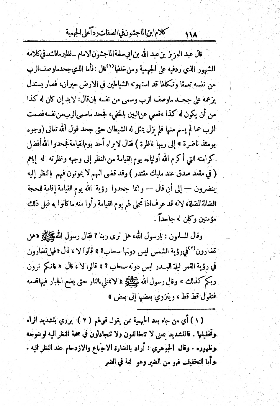 قال عبد العزيز بن عبد الله بن أبي سلمة الماجشون الإمام - نظير مالك - في كلامه المشهور الذي رد فيه على الجهمية ومن خلفها (1) قال: فأما الذي جحد ما وصف الرب من نفسه تعمقاً وتكلفاً قد استهوته الشياطين في الأرض حيران، فصار يستدل بزعمه على جحد ما وصف الرب وسمى من نفسه بأن قال: لا بد إن كان له كذا من أن يكون له كذا، فعمي عن البين بالخفي، فجحد ما سمى البر من نفسه فصمت الرب عما لم يسم منها فلم يزل يمثل له الشيطان حتى جحد قول الله تعالى (وجوه يومئذ ناضرة، إلى ربها ناظرة) فقال لا يراه أحد يوم القيامة فجحدوا الله أفضل كرامته التي أكرم الله أولياءه يوم القيامة من النظر إلى وجهه ونظرته له إياهم (في مقعد صدق عند مليك مقتدر) وقد قضى أنهم لا يموتون فهم بالنظر إليه ينضرون - إلى أن قال - وإنما جحدوا رؤية الله يوم القيامة إقامة للحجة الضالة المضلة، لأنه قد عرف إذا تجلى لهم يوم القيامة رأوا منه ما كانوا به قبل ذلك مؤمنين وكان له جاحداً.