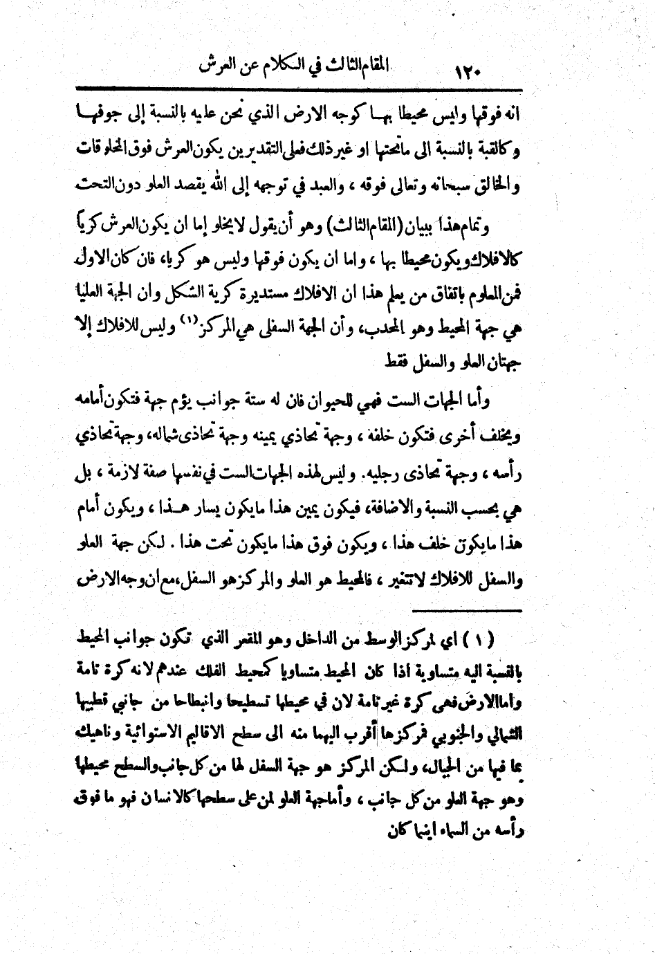وتمام هذا ببيان (المقام الثالث) وهو أن يقول لا يخلو إما أن يكون العرش كرياً كالأفلاك ويكون محيطاً بها، وأما أن يكون فوقها وليس هو كرياً، فإن كان الأول فمن المعلوم باتفاق من يعلم هذا أن الأفلاك مستديرة كرية الشكل وأن الجهة العليا هي جهة المحيط وهو المحدب، وأن الجهة السفلى هي المركز (1) وليس للأفلاك إلا جهتان العلو والسفل فقط.