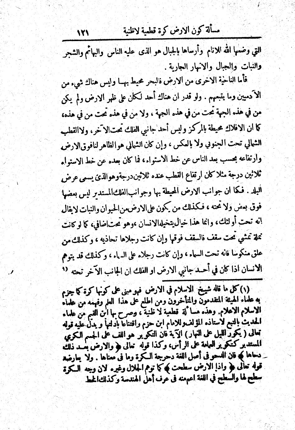 (1) كل ما قاله شيخ الإسلام في الأرض فهو مبني على كونها كرة كما جزم به علماء الهيئة المتقدمون والمتأخرون ومن اطلع على هذا العلم وفهمه من علماء الإسلام الأعلام. وهذه مسألة قطعية لا ظنية، وصرح بها ابن القيم من علماء الحديث بالتبع لاستاذه المؤلف وللإمام ابن حزم واقتناعا بأدلتها ويدل عليه قوله تعالى (يكور الليل على النهار) الآية فان التكوير هو اللف على الجسم الكري المستدير كتكوير العمامة على الرأس، وكذا قوله تعالى (والأرض بعد ذلك دحاها) فان الدحو في أصل اللغة دحرجة الكرة وما في معناها. ولا يعارضه قوله تعالى (وإذا الأرض سطحت) كما توهم الجلال وغيره لأن وجه الكرة