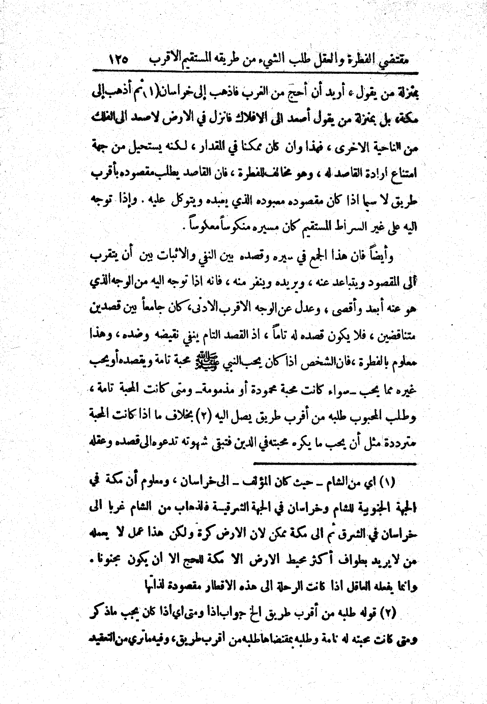 بمنزلة من يقول، أريد أن أحج من الغرب فأذهب إلى خراسان (1) ثم أذهب إلى مكة، بل بمنزلة من يقول أصعد إلى الأفلاك فأنزل في الأرض لأصعد إلى الفلك من الناحية الأخرى، فهذا وإن كان ممكناً في المقدار، لكنه يستحيل من جهة امتناع إرادة القاصد له، وهو مخالف للفطرة، فإن القاصد يطلب مقصوده بأقرب طريق لا سيما إذا كان مقصوده معبوده الذي يعبده ويتوكل عليه. وإذا توجه إليه على غير السراط المستقيم كان مسيره منكوساً معكوساً.