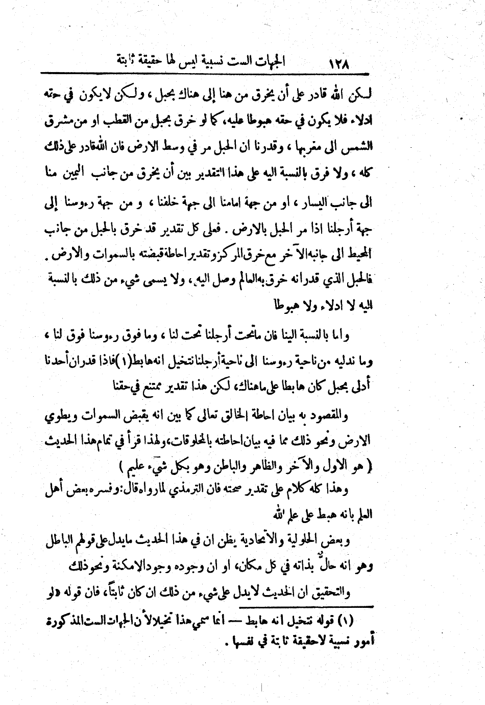 لكن الله قادر على أن يخرق من هنا إلى هناك بحبل، ولكن لا يكون في حقه إدلاء فلا يكون في حقه هبوطاً عليه، كما لو خرق بحبل من القطب أو من مشرق الشمس إلى مغربها، وقدرنا أن الحبل مر في وسط الأرض فإن الله قادر على ذلك كله، ولا فرق بالنسبة إليه على هذا التقدير بين أن يخرق من جانب اليمين منا إلى جانب اليسار، أو من جهة أمامنا إلى جهة خلفنا، ومن جهة رؤوسنا إلى جهة أرجلنا إذا مر الحبل بالأرض. فعلى كل تقدير قد خرق بالحبل من جانب المحيط إلى جانبه الآخر مع خرق المركز وتقدير إحاطة قبضته بالسموات والأرض. فالحبل الذي قدر أنه خرق به العالم وصل إليه، ولا يسمى شيء من ذلك بالنسبة إليه لا إدلاء وهبوطاً.