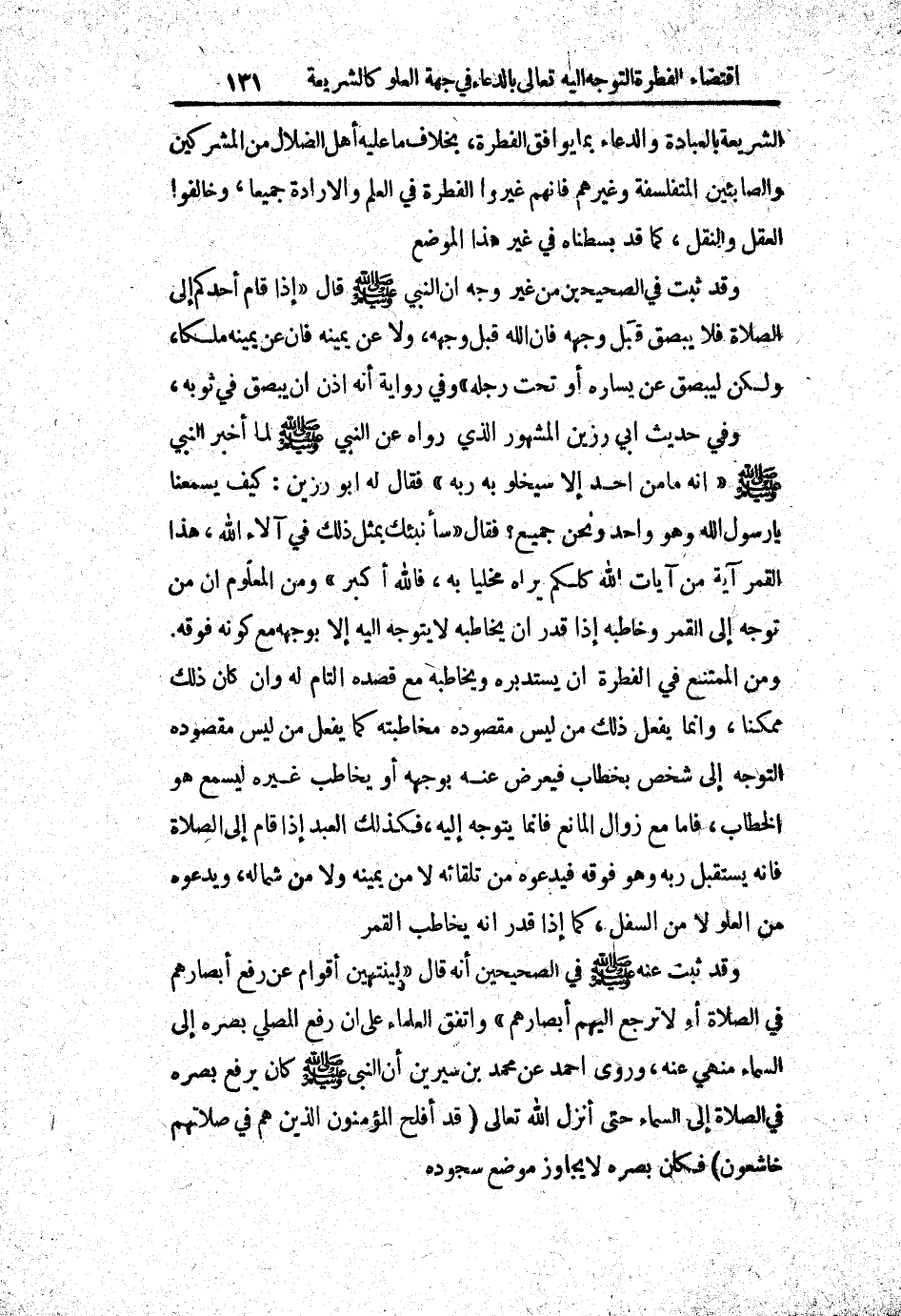 وفي حديث أبي رزين المشهور الذي رواه عن النبي صلى الله عليه وسلم لما أخبر النبي صلى الله عليه وسلم " أنه ما من أحد إلا سيخلو به ربه " فقال له أبو رزين: كيف يسمعنا يا رسول الله وهو واحد ونحن جميع؟ فقال " سأنبئك بمثل ذلك في آلاء الله، هذا القمر آية من آيات الله كلهم يراه مخلياً به، فالله أكبر " ومن المعلوم أن من توجه إلى القمر وخاطبه إذا قدر أن يخاطبه لا يتوجه إليه إلا بوجهه مع كونه فوقه. ومن الممتنع في الفطرة أن يستدبره ويخاطبه مع قصده التام له وإن كان كل ذلك ممكناً، وإنما يفعل ذلك من ليس مقصوده مخاطبته كما يفعل من ليس مقصوده الخطاب، فإما مع زوال المانع فإنما يتوجه إليه، فكذلك العبد إذا قام إلى الصلاة فإنه يستقبل ربه وهو فوقه فيدعوه من تلقائه لا من يمينه ولا من شماله، ويدعوه من العلو لا من السفل، كما إذا قدر أنه يخاطب القمر.