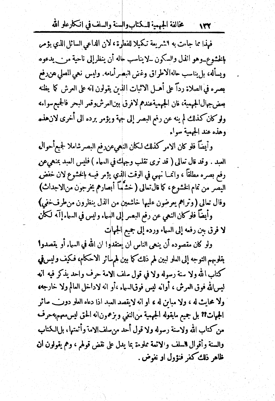 ولو كان مقصوده أن ينهى الناس أن يعتقدوا أن الله في السماء أو يقصدوا بقلوبهم التوجه إلى العلو لبين لهم ذلك كما بين لهم سائر الأحكام، فكيف وليس في كتاب الله ولا سنة رسوله ولا في قول سلف الأمة حرف واحد يذكر فيه أنه ليس الله فوق العرش، أو أنه ليس فوق السماء، أو أنه لا داخل العالم ولا خارجه، ولا محايث له، ولا مبين له، أو أنه لا يقصد العبد إذا دعاه العلو دون سائر الجهات؟ بل جميع ما يقوله الجهمية من النفي ويزعمون أنه الحق ليس معهم به حرف من كتاب الله ولا سنة رسوله ولا قول أحد من سلف الأمة وأئمتها، بل الكتاب والسنة وأقوال السلف والأئمة مملوءة بما يدل على نقض قولهم، وهم يقولون أن ظاهر ذلك كفر فنؤول أو نفوض.