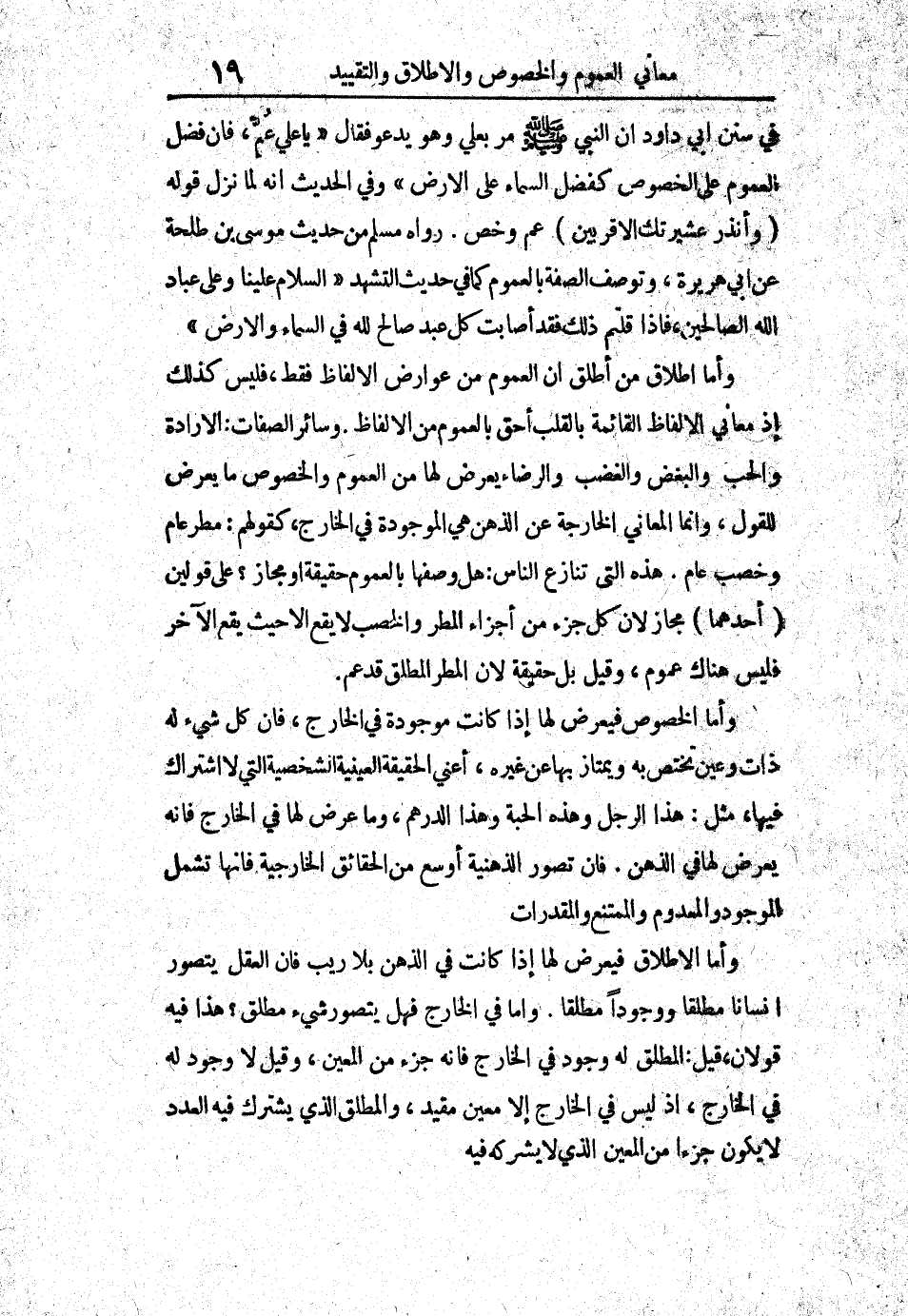 في سنن أبي داود أن النبي صلى الله عليه وسلم مر بعلي وهو يدعو فقال " يا علي عم، فإن فضل العموم على الخصوص كفضل السماء على الأرض " وفي الحديث أنه لما نزل قوله (وأنذر عشيرتك الأقربين) عم وخص. رواه مسلم من حديث موسى بن طلحة عن أبي هريرة، وتوصف الصفة بالعموم كما في حديث التشهد " السلام علينا وعلى عباد الله الصالحين، فإذا قلتم ذلك فقد أصابت كل عبد صالح لله في السماء والأرض ".