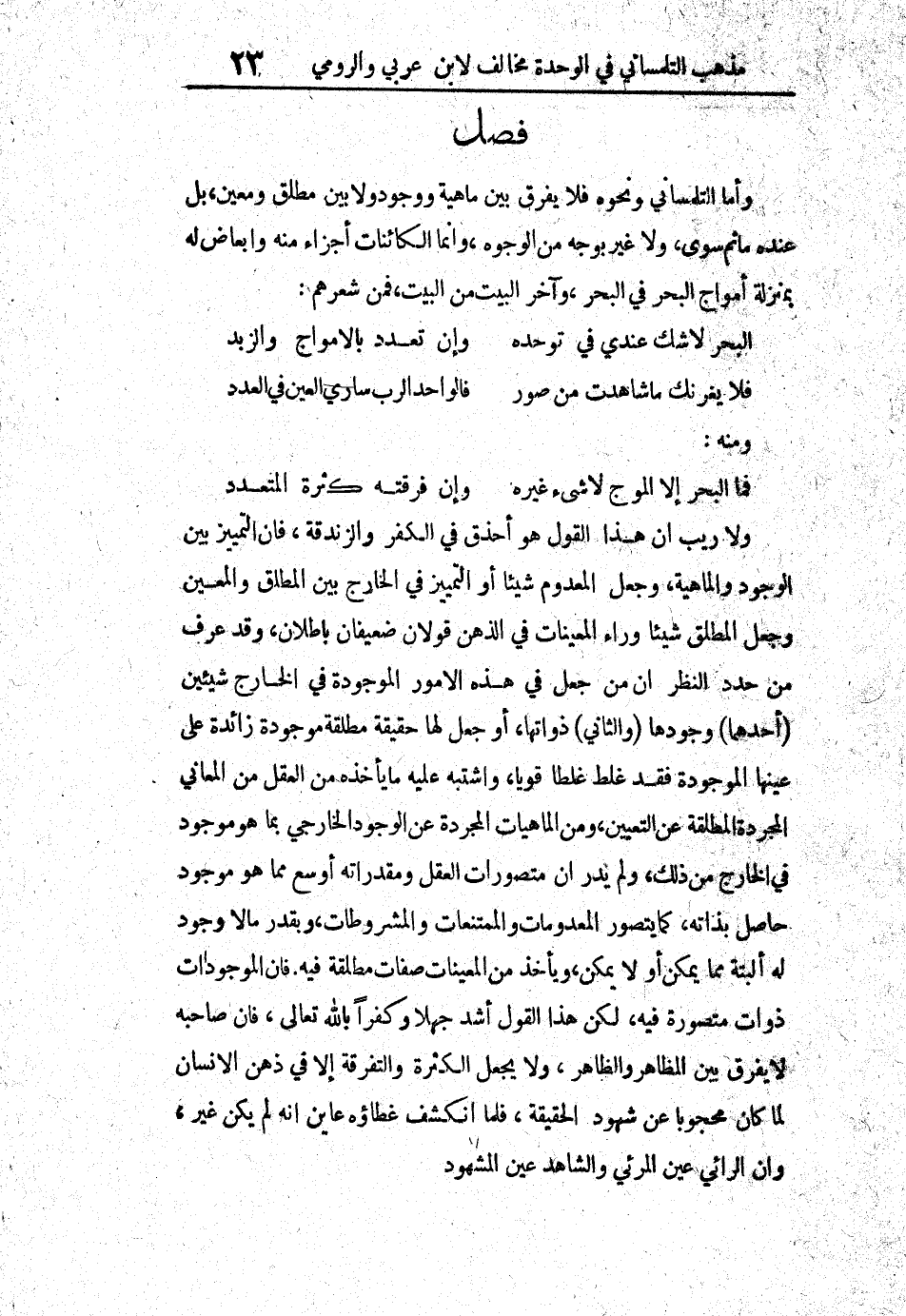 وأما التلمساني ونحوه فلا يفرق بين ماهية ووجود ولا بين مطلق ومعين، بل عنده ما ثم سوى، ولا غير بوجه من الوجه، وإنما الكائنات أجزاء منه وأبعاض له بمنزلة أمواج البحر في البحر، وآخر البيت من البيت، فمن شعرهم: