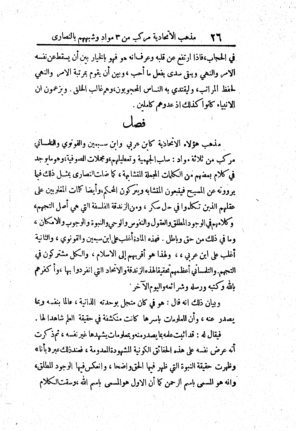 مذهب هؤلاء الاتحادية كابن عربي وابن سبعين والقونومي والتلمساني مركب من ثلاثة مواد: سلب الجهمية وتعطيلهم، ومجملات الصوفية، وهو ما يوجد في كلام بعضهم من الكلمات المجملة المتشابهة، كما ضلت النصارى بمثل ذلك فيما يروونه عن المسيح فيتبعون المتشابه ويتركون المحكم، وأيضاً كلمات المغلوبين على عقلهم الذين تكلموا في حال سكر، ومن الزندقة الفلسفة التي هي أصل التجهم، وكلامهم في الوجود المطلق والعقول والنفوس والوحي والنبوة والوجوب والإمكان، وما في ذلك من حق وباطل. فهذه المادة أغلب على ابن سبعين والقونوي، والثانية أغلب على ابن عربي، ولهذا هو أقربهم إلى الإسلام، والكل مشتركون في التجهم. والتلمساني أعظمهم تحقيقاً لهذه الزندقة والاتحاد التي انفردوا بها، وأكفرهم بالله وكتبه ورسله وشرائعه واليوم الآخر.
