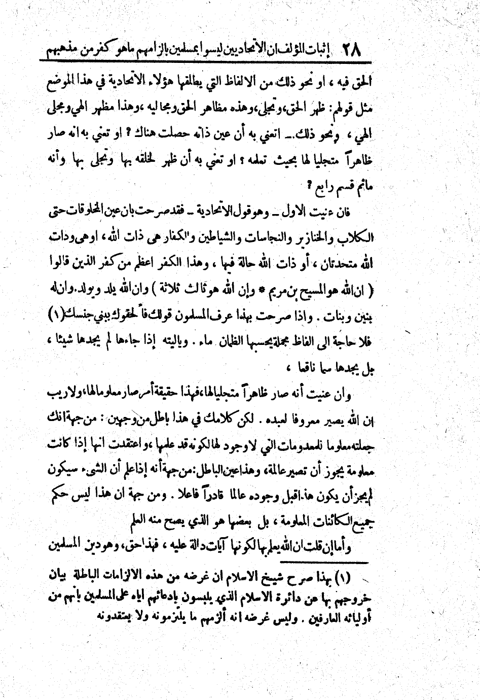 (1) بهذا صرح شيخ الاسلام أن غرضه من هذه الالزامات الباطلة بيان خروجهم بها عن دائرة الإسلام الذي يلبسون بادعائهم اياه على المسلمين بانهم من أوليائه العارفين. وليس غرضه أنه ألزمهم ما يلتزمونه ولا يعتقدونه
