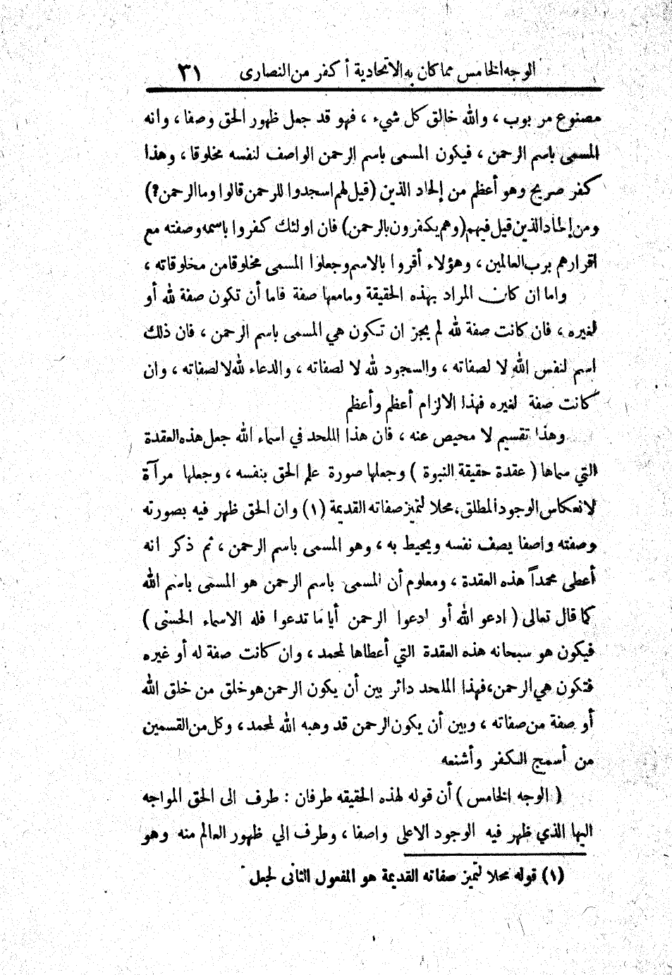 مصنوع مربوب، والله خالق كل شيء، فهو قد جعل ظهور الحق وصفاً، وأنه المسمى باسم الرحمن، فيكون المسمى باسم الرحمن الواصف لنفسه مخلوقاً، وهذا كفر صريح وهو أعظم من إلحاد الذين (قيل لهم اسجدوا للرحمن قالوا وما الرحمن؟) ومن إلحاد الذين قيل فيهم (وهم يكفرون بالرحمن) فإن أولئك كفروا باسمه وصفته مع إقرارهم برب العالمين، وهؤلاء أقروا بالاسم وجعلوا المسمى مخلوقاً من مخلوقاته.